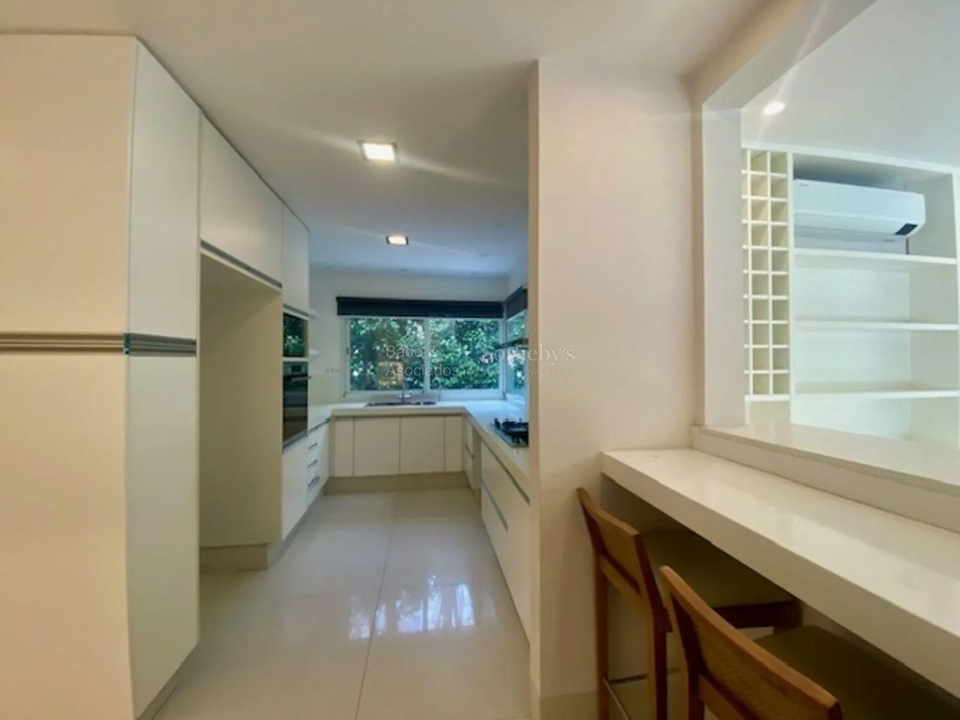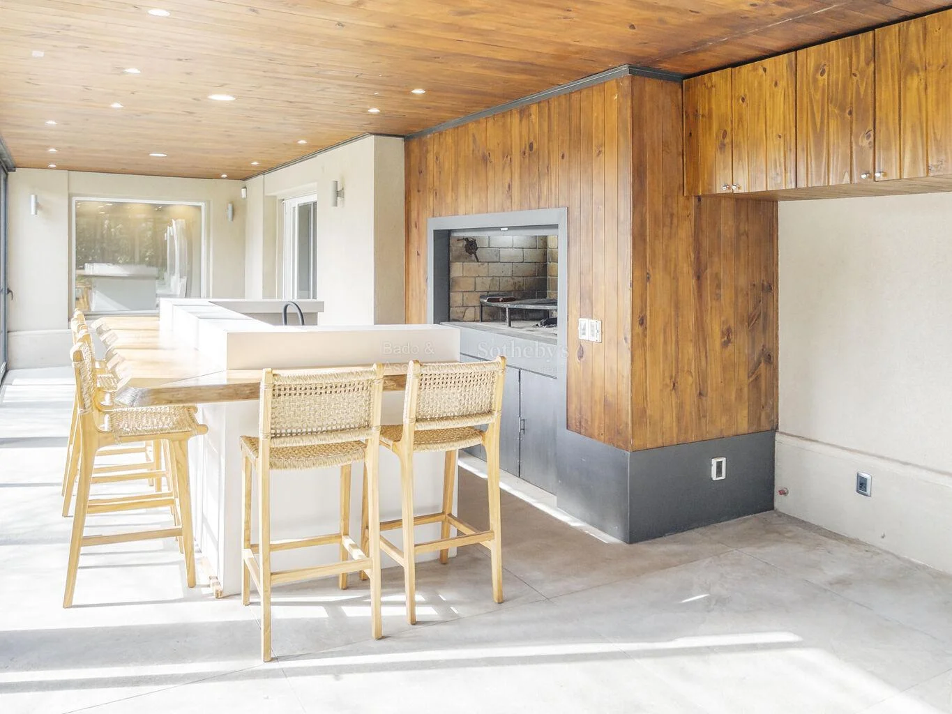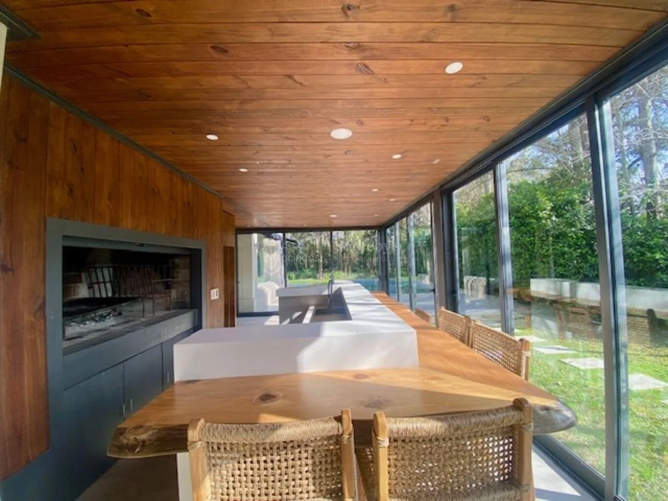 Cocina, integrada a estar familiar con estufa a leña y acceso a barbacoa cerrada con parrillero y salida al jardín.