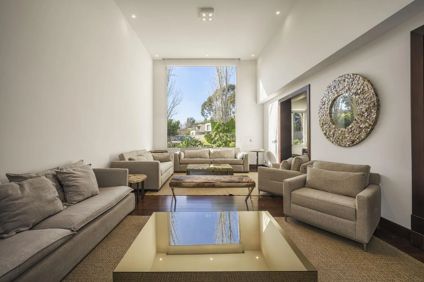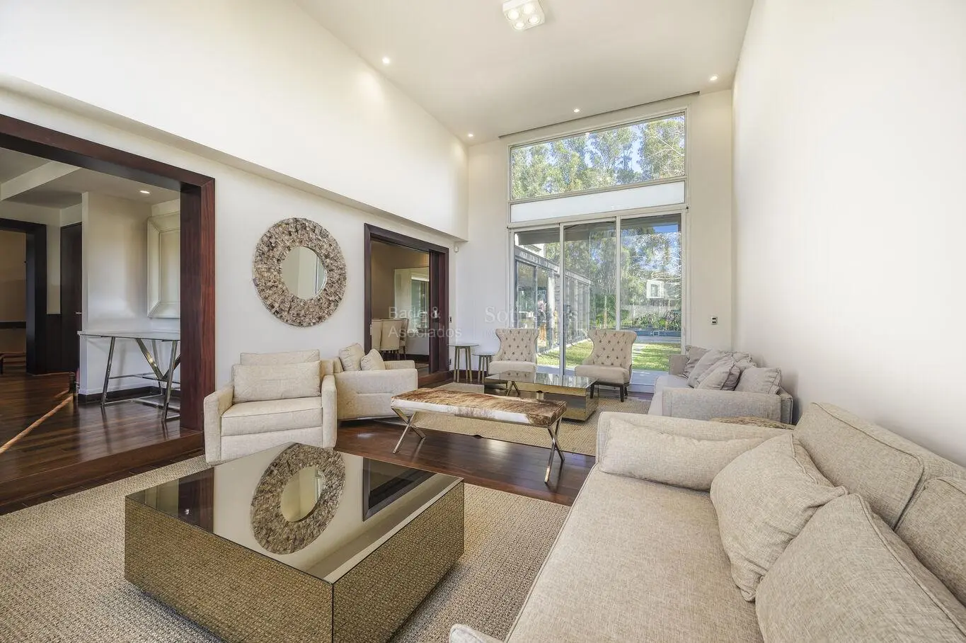 En planta baja, amplia recepción, escritorio, estar, gran living con ventanales en doble altura, comedor independiente y toilette.