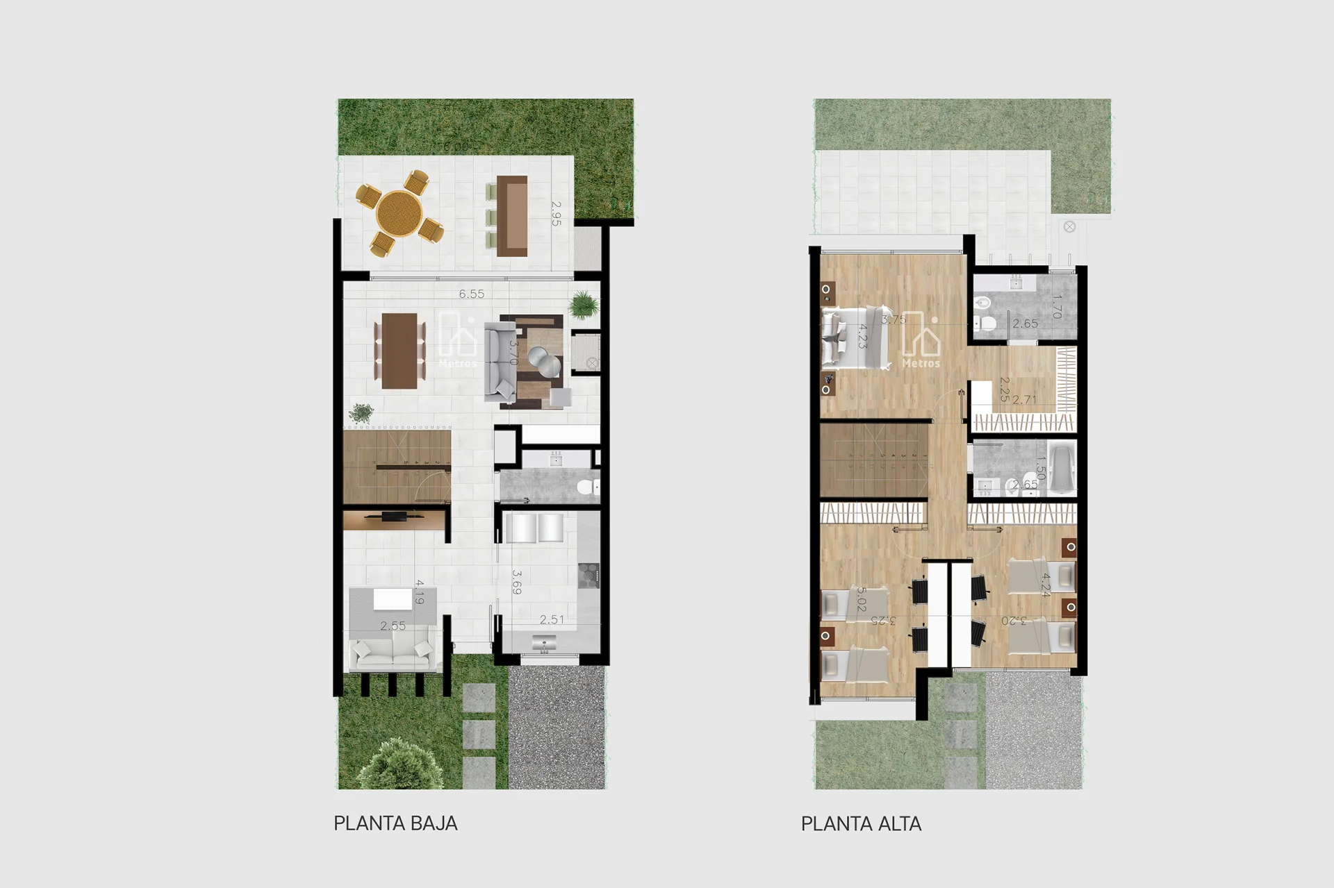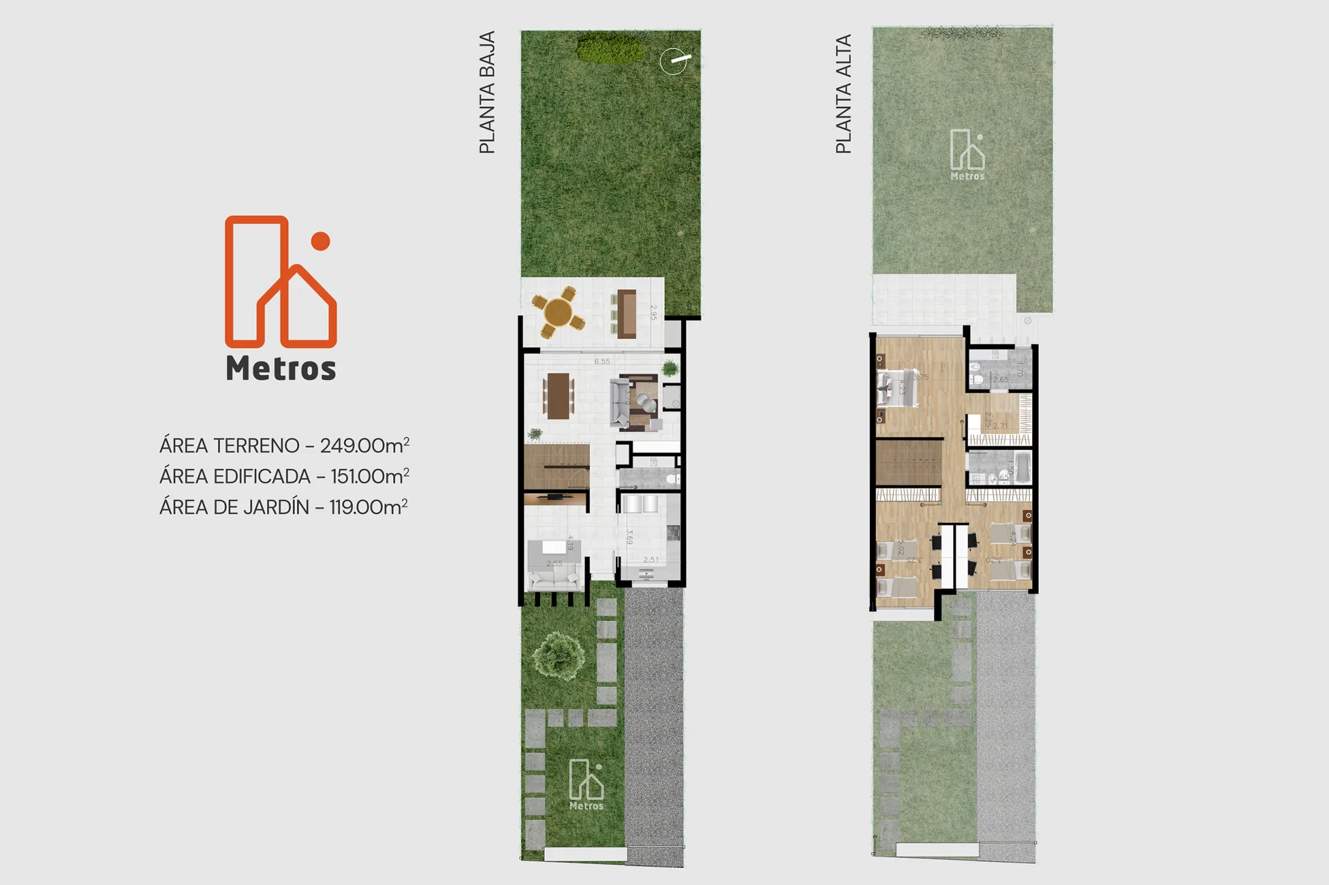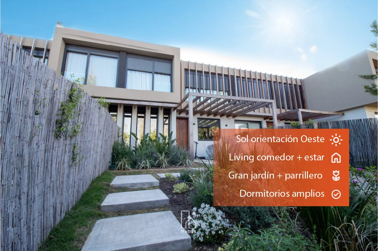 DESTACAMOS Sol orientación Oeste • Living + estar • Jardín + parrillero • Dormitorios amplios • Cocina definida con sol de la mañana • Seguridad del barrio LA ZONA Barrio parques, rodeado de buen paisaje y tranquilidad. Se caracteriza por su entorno natural con lagos y espacios verdes, calles internas seguras y un ambiente ideal para familias. Cuenta con vigilancia las 24 horas del día, para que tus chicos puedan disfrutar en todo momento. Ubicado a 30 min del centro de Montevideo, a 5min de los Colegios más importantes de la capital, a 10 del Aeropuerto de Carrasco y a 10min del Centro de Carrasco. Vivir en Barrio Parques combina la tranquilidad de un entorno residencial con la comodidad de estar cerca de todo. AMBIENTES 3 dormitorios, el principal con vestidor y baño en suite • Amplio living comedor + estar • Jardín con parrillero • 3 baños • Cocina definida • Garaje para 2 autos LA CASA Casa de 2 plantas en un terreno de 249m2 con 151m2 edificados y 119m2 de jardín. En planta baja ofrece un luminoso living comedor con estar y estufa a leña, con amplios ventanales corredizos que integran el interior al jardín con parrillero. El fondo cuenta con orientación Oeste, ideal para disfrutar del sol de la tarde. Cocina definida con muy buena luz natural en las mañanas y baño social. En planta alta se distribuyen 3 dormitorios de generosas dimensiones y un baño completo. El dormitorio principal destaca por su gran ventanal al Oeste, vestidor y baño en suite. La propiedad cuenta con espacio de guardado bajo escalera iluminada por tragaluz, persianas eléctricas, calefacción y Eurocable en todos los ambientes, además de garaje con espacio para 2 autos. PRECIOS Y GASTOS Gastos comunes: $7.000 Comisión Inmobiliaria: 3% + iva ¡Te deseamos suerte en tu búsqueda, y estamos para ayudarte tanto con esta propiedad o también para ayudarte buscando otras opciones en todo el mercado! No dudes en contactarnos. Inmobiliaria Metros Consulta nuestra web y redes sociales para encontrar otras oportunidades. Instagram: metros.inmobiliaria