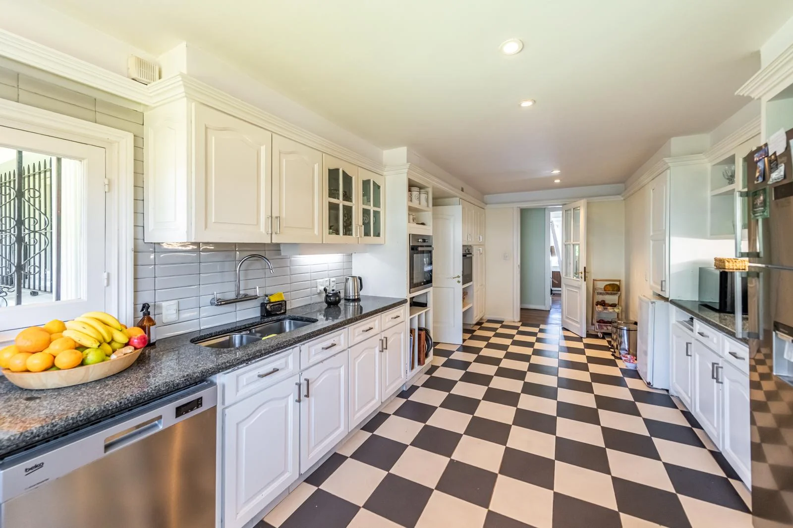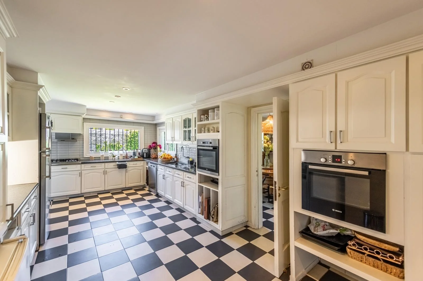 - Cocina moderna con horno, campana, anafe, piso damero y comedor diario.