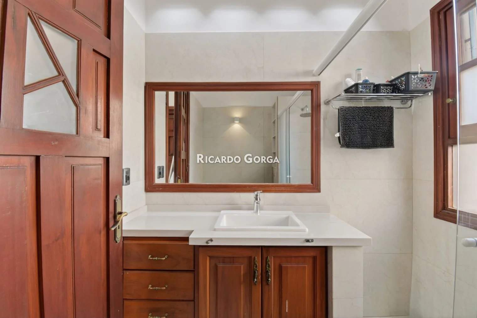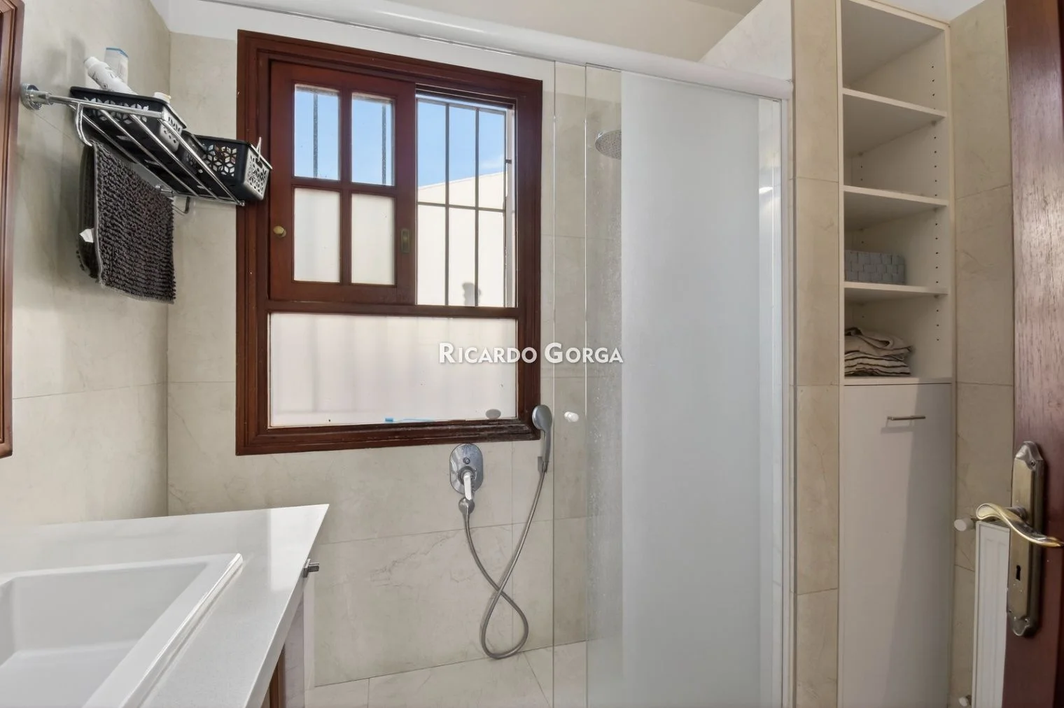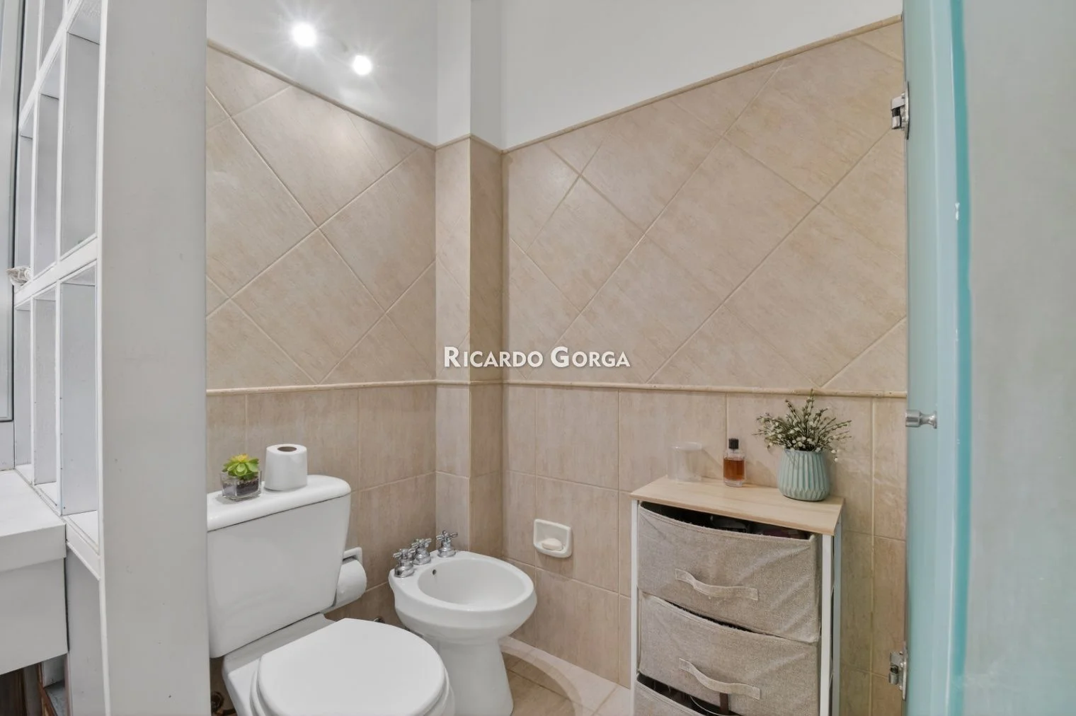 Baño completo en planta baja con bacha, ducha con mampara de cristal y revestimiento cerámico