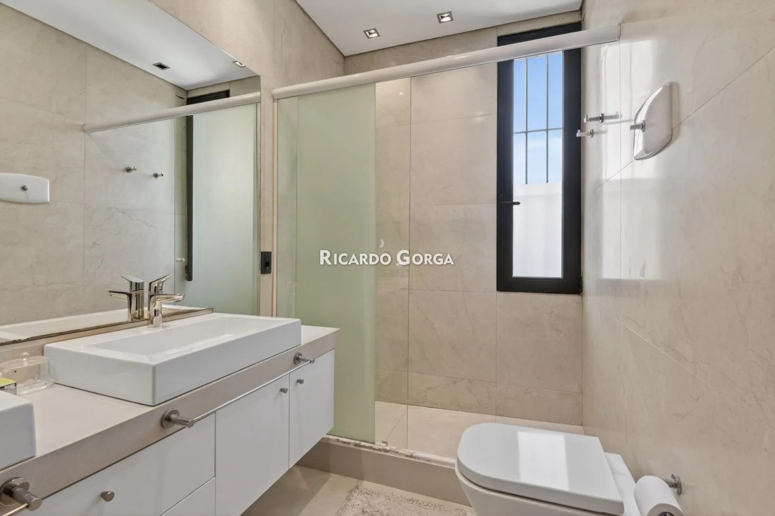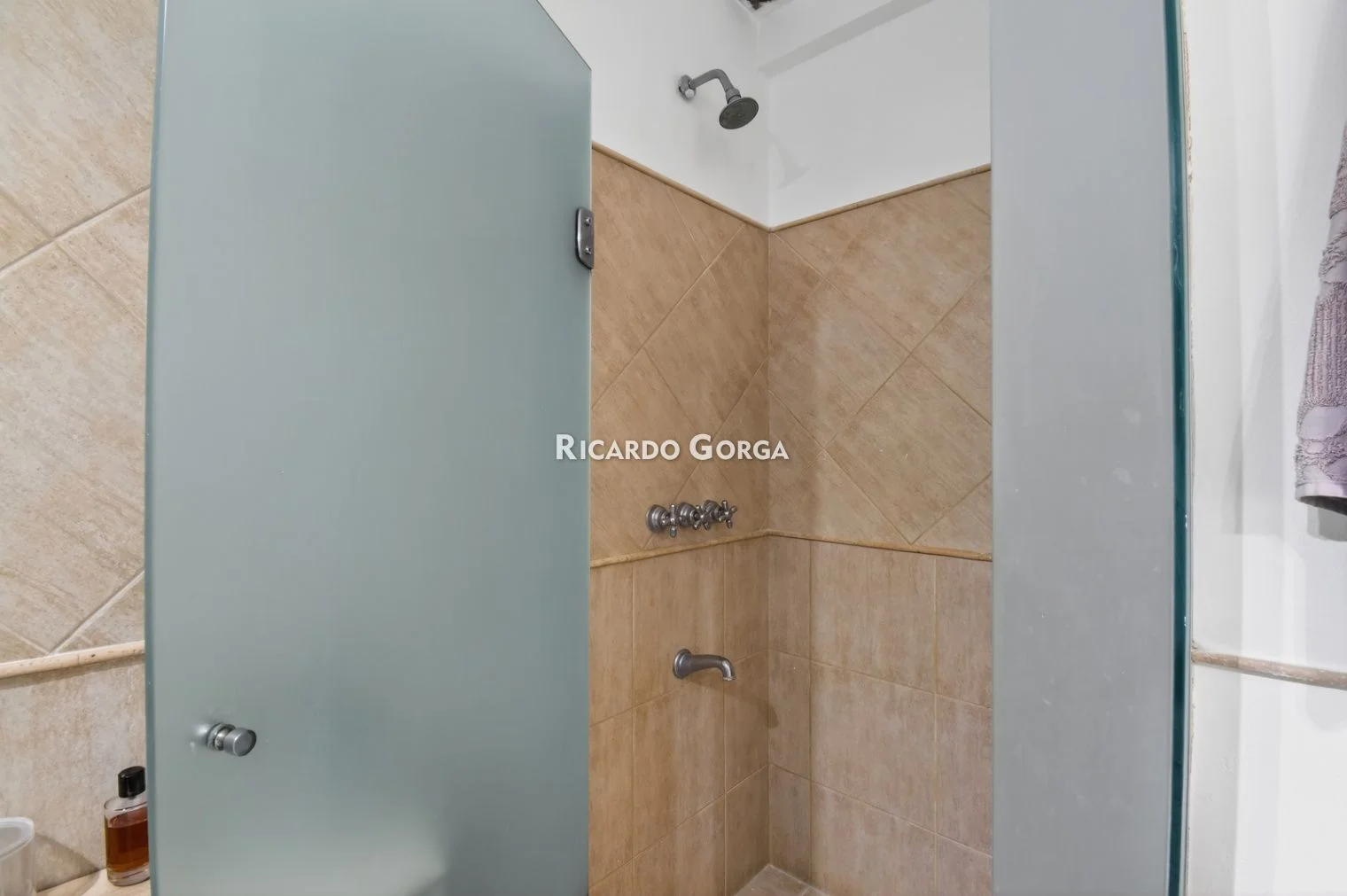 Baño completo con piso porcelanato, placard, gran ducha y mesada silestone