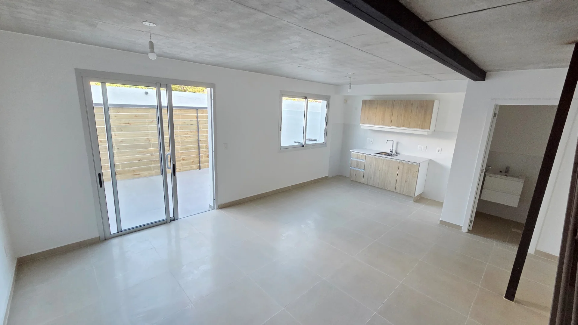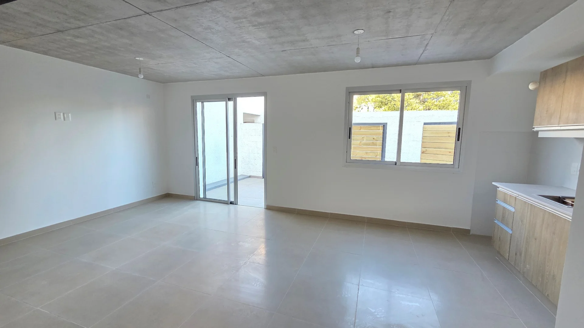 Se accede por corredor abierto, ingresando a patio de uso exclusivo de cada unidad. Accesos por puerta ventana en aluminio, en planta baja posee living comedor con cocina integrada con lindos placares aéreos y bajo mesada, pisos en cerámica y baño social.