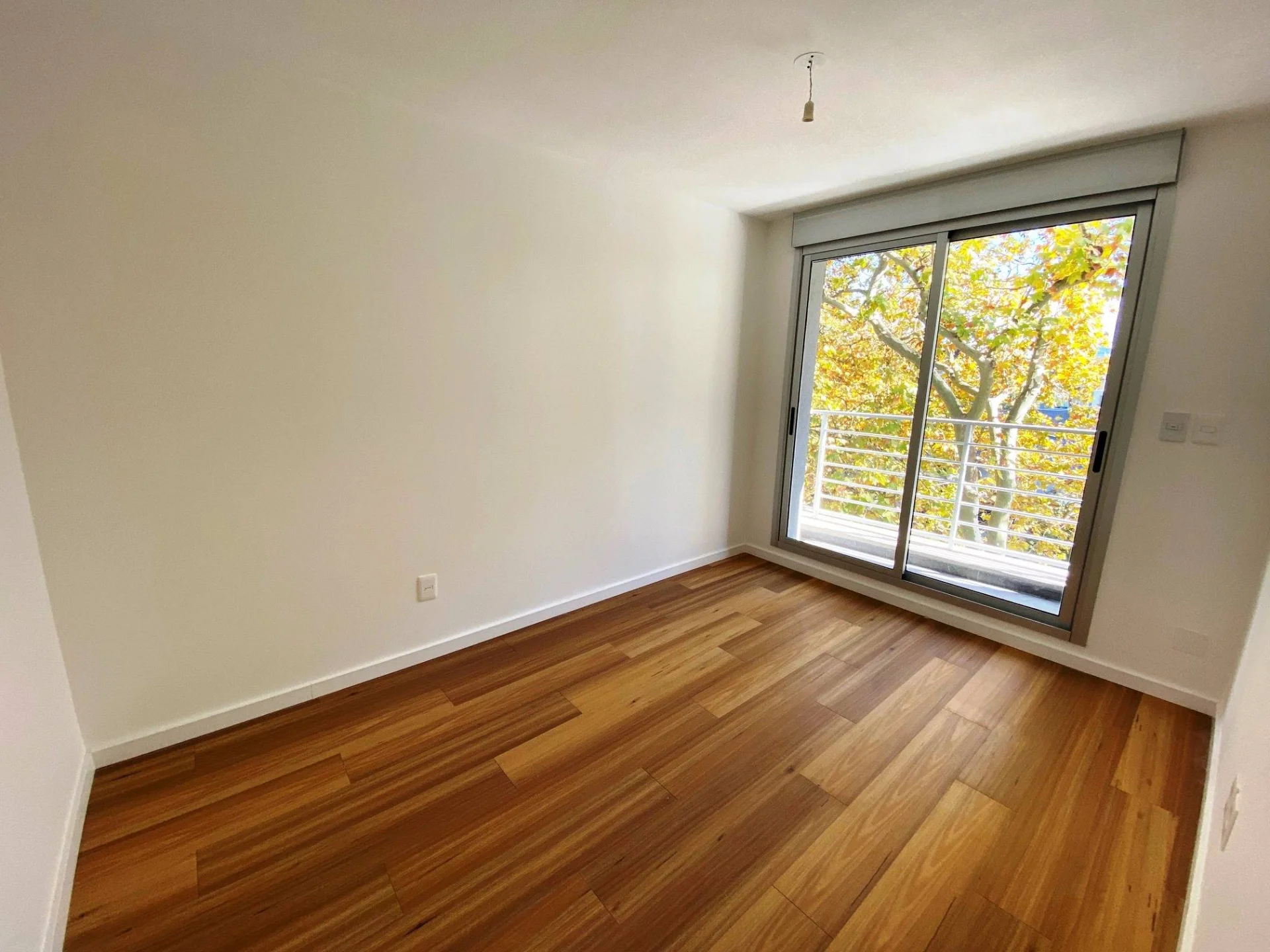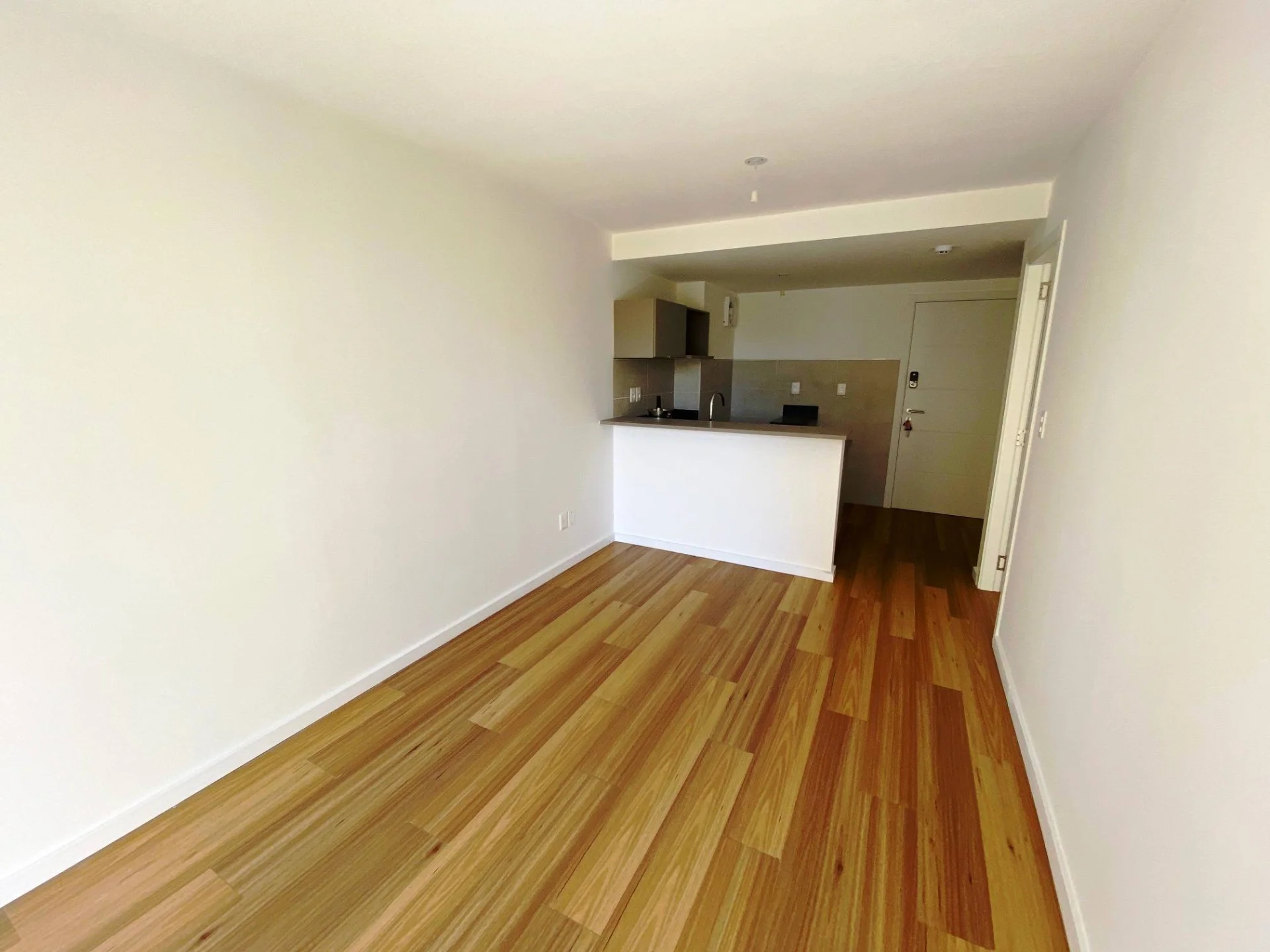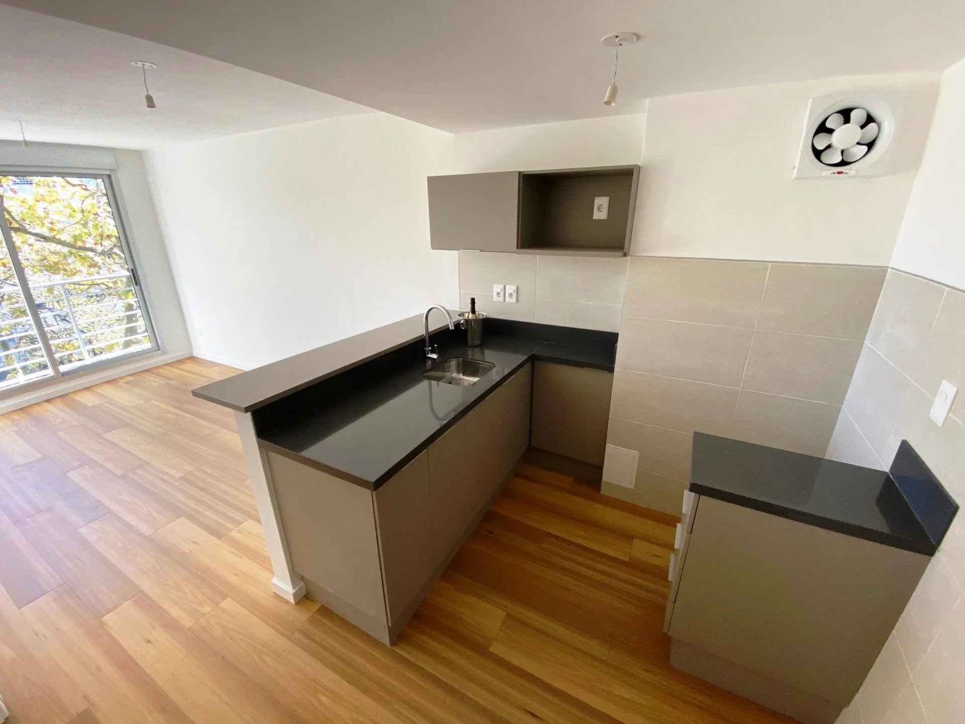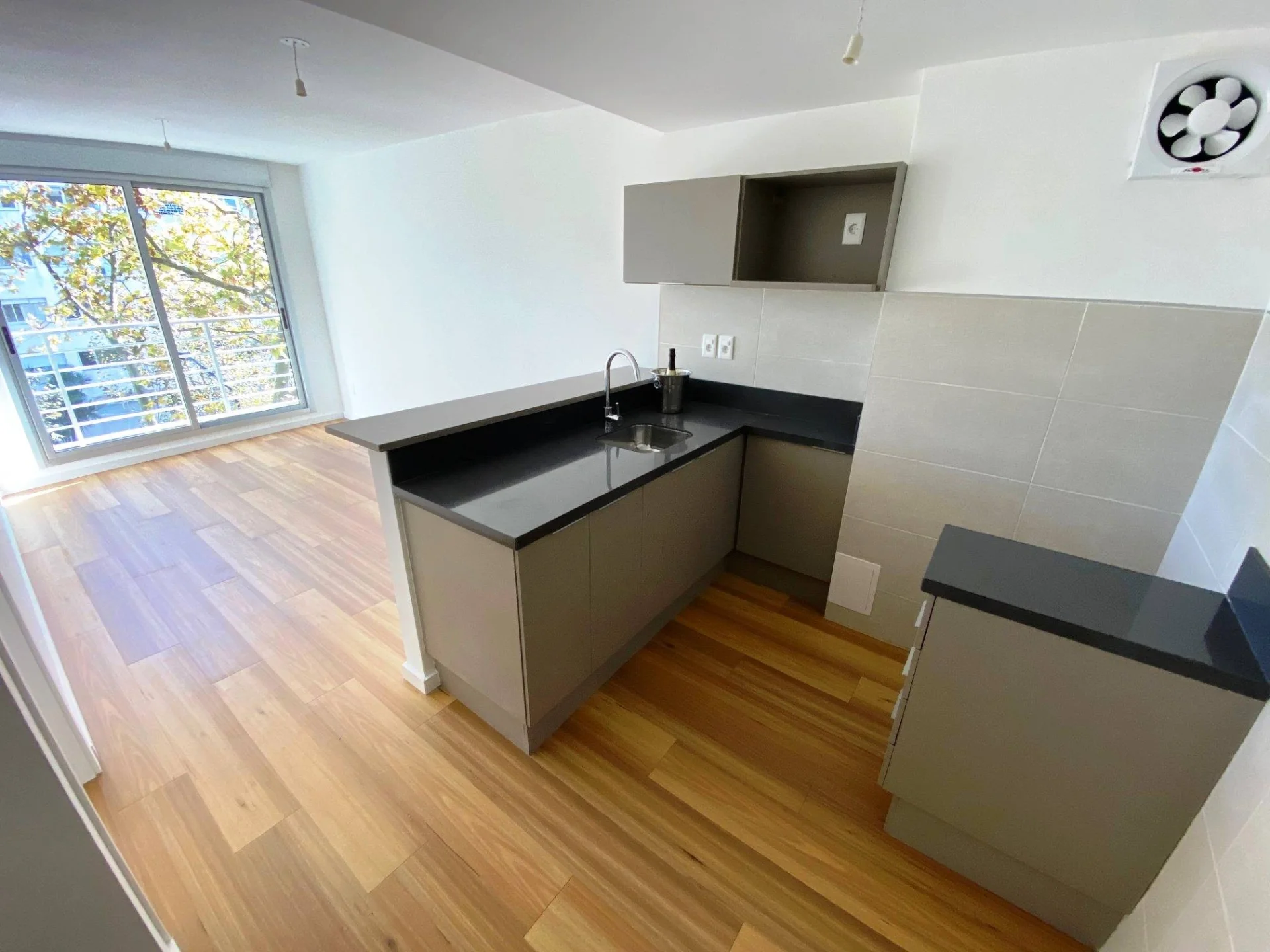 Apartamento al frente: 1 dormitorio con terraza; living comedor; cocina semi integrada con placares; baño completo.
