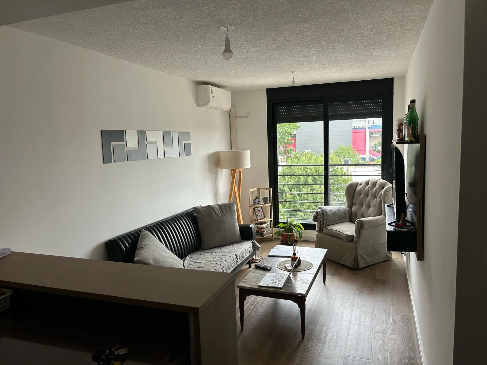 Living comedor con cocina semi integrada, placares aereos y bajo mesada.