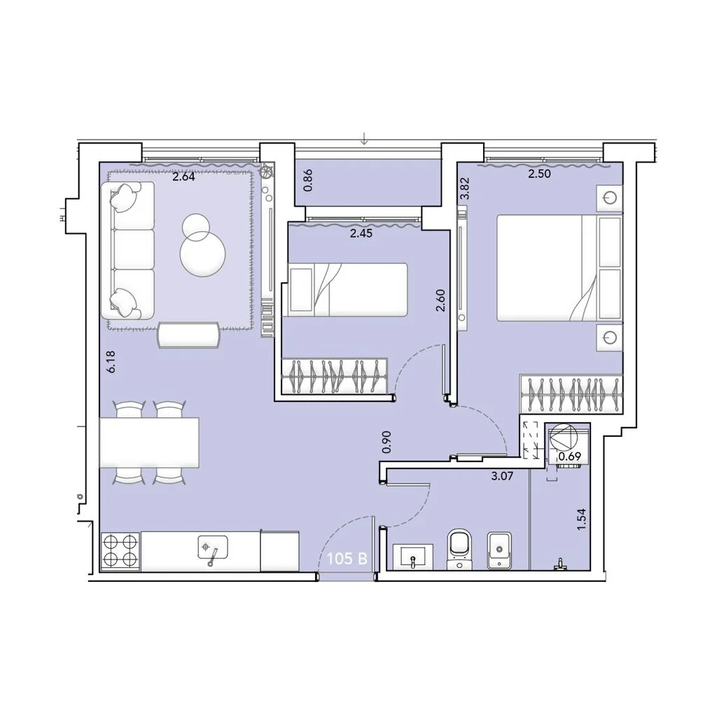 Se ubica en el quinto piso por ascensor, en la Torre B y cuenta con una superficie total de 52 m2.
