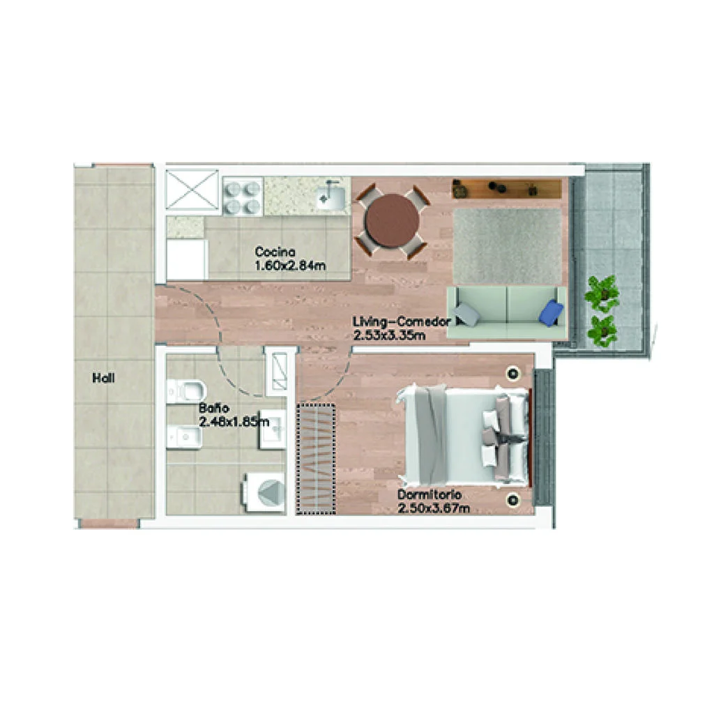 Se ubica en el primer piso, en la Torre A y cuenta con una superficie de 38 m2.
