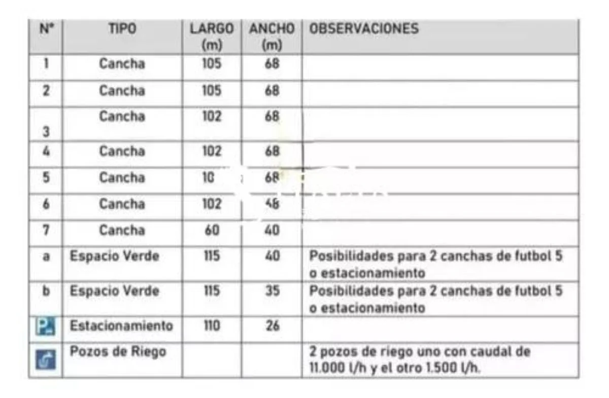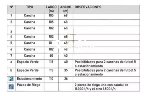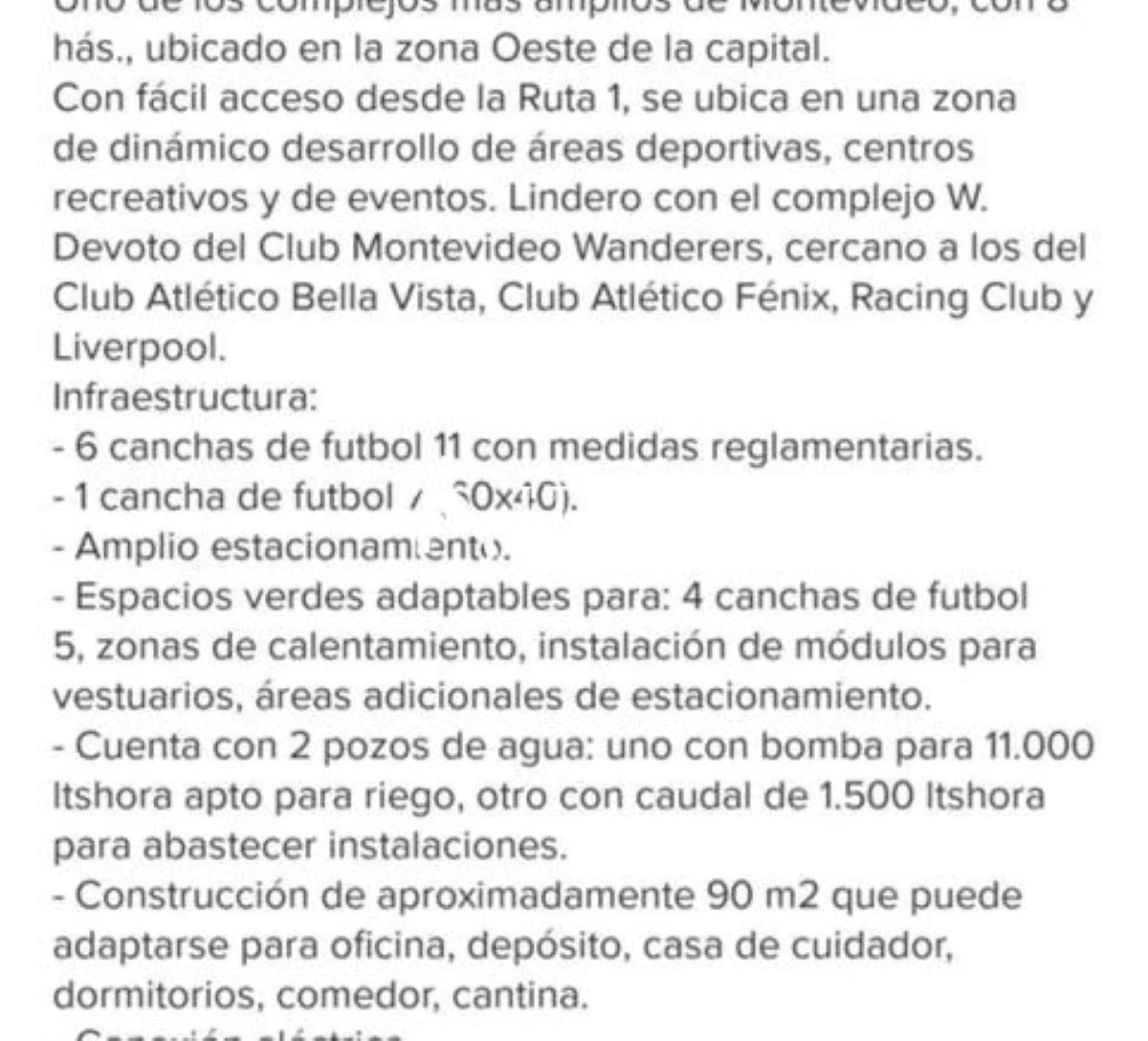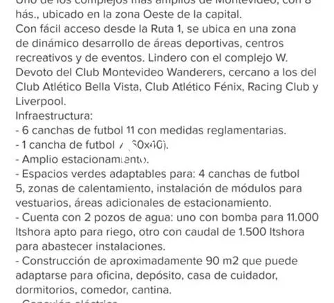 Venta de gran Complejo deportivo ideal SAD, clubes profesionales o amateurs.Se encuentra en una zona de varios complejos complejos de primera división ya instalados. Con facil acceso desde Ruta 1 en una zona de gran desarrollo deportivo.Cuenta con un terreno de 8 héctareas, ubicado en la zona Oeste de Montevideo lindero con Complejo Walter Devoto del Club Montevideo Wanderers, cercano a Complejos: Bella Vista, Club Atlético Fénix, Racing y Liverpool. Actualmente se encuentra alquilado a un club profesional. El Complejo cuenta con :– 6 Canchas de Futbol 11, con las medidas reglamentarias.– 1 Cancha de Futbol 7.– Amplios Estacionamientos.– Espacios verdes adaptables para Canchas de Futbol 5, zona de calentamiento, estacionamientos, etc.– 2 Pozos de agua uno con bomba con caudal para riego de 11000 litros hora, y otro con un caudal de 1500 para abastecer las instalaciones.– Construcción de apróx. 90 mts2 que puede adaptarse como deposito, oficinas, casa, etc. Se puede llegar a anexar otro complejo ya instalado de unas 8 hectáreas más pegado al que se encuentra a la venta (precio a convenir).
