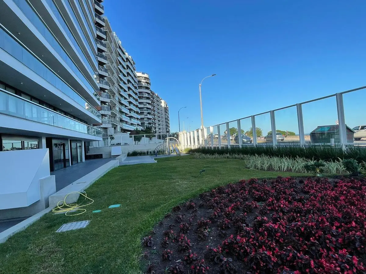 En planta baja, el edificio ofrece un amplio jardín frontal con equipamiento urbano.