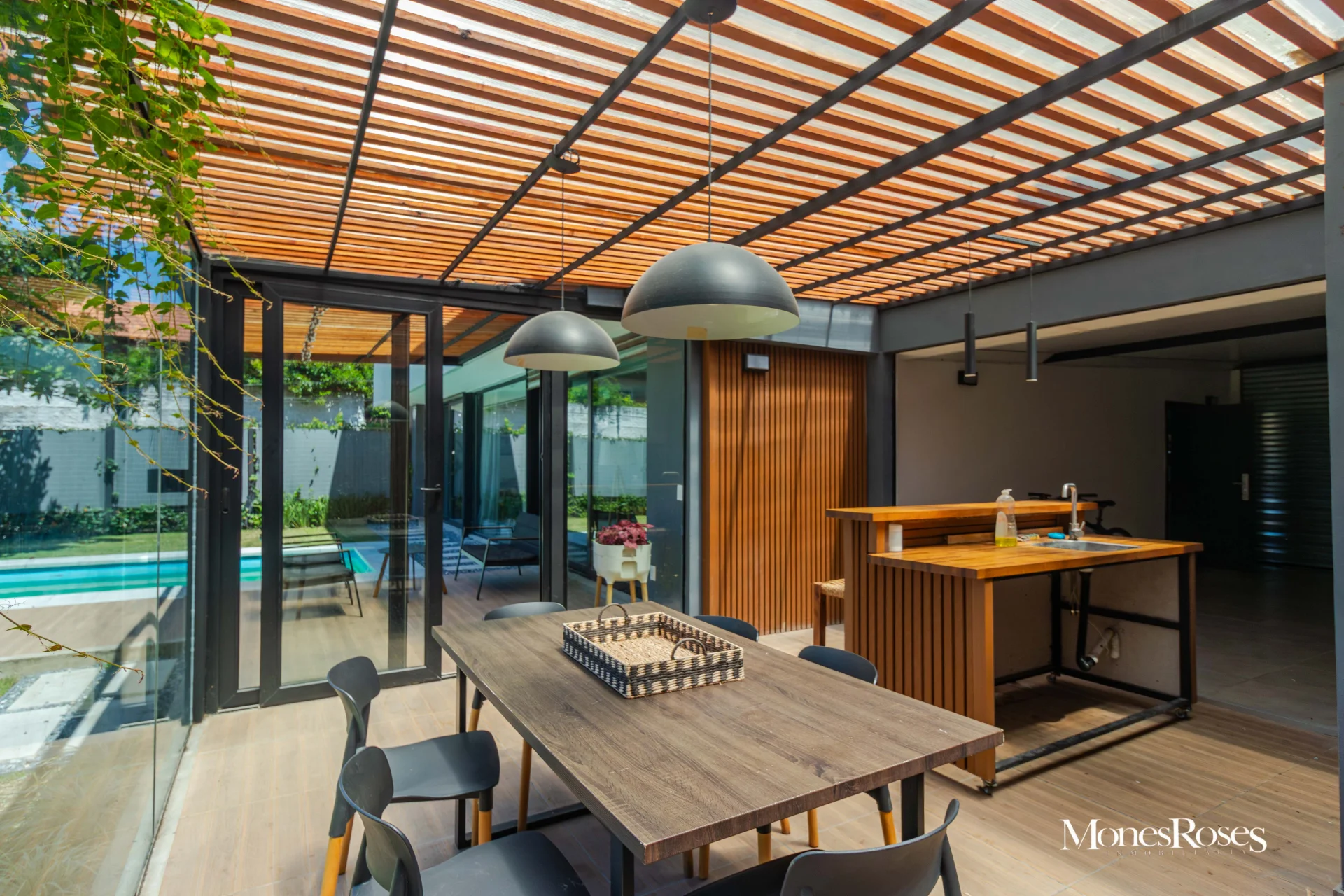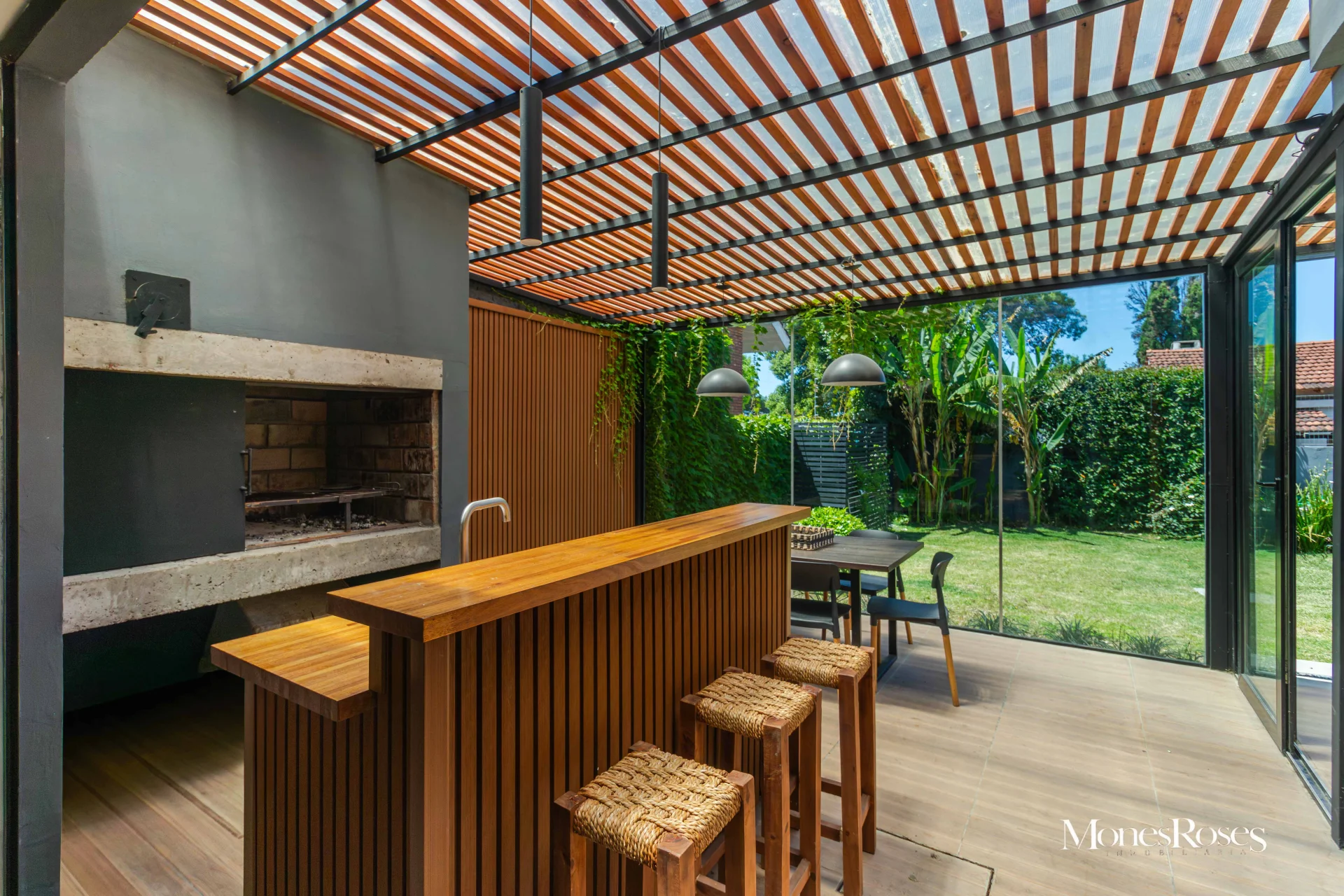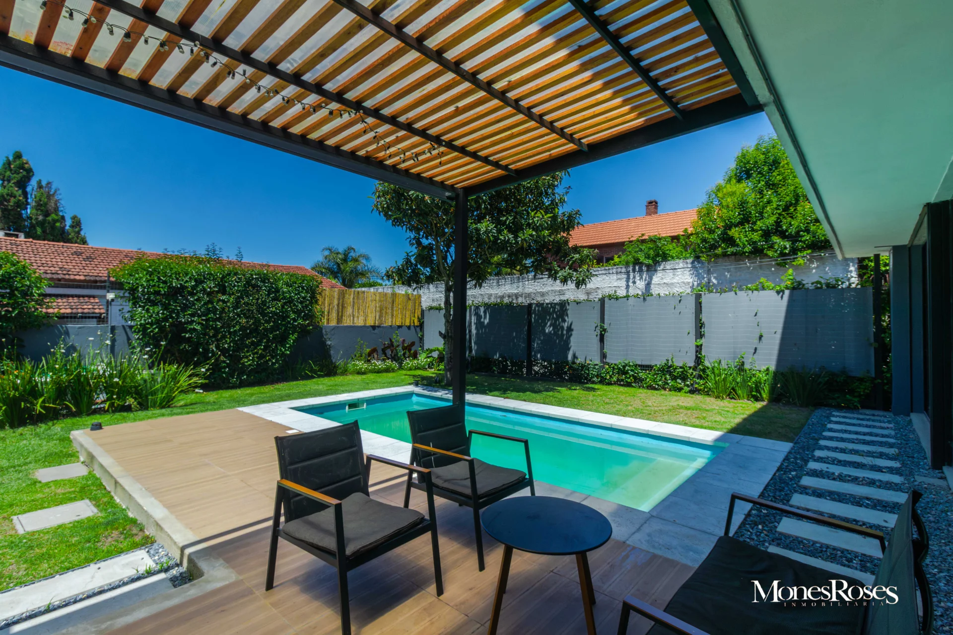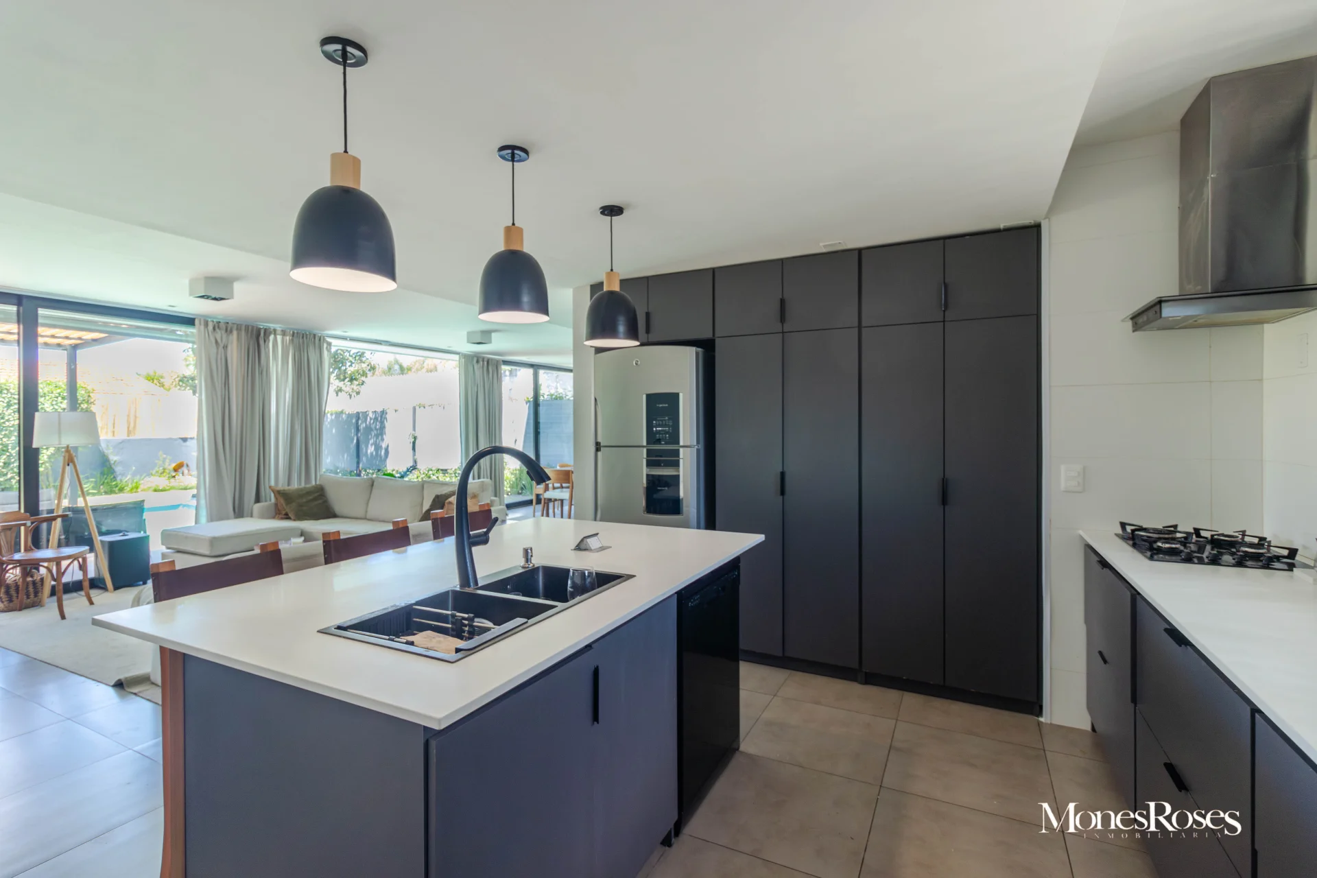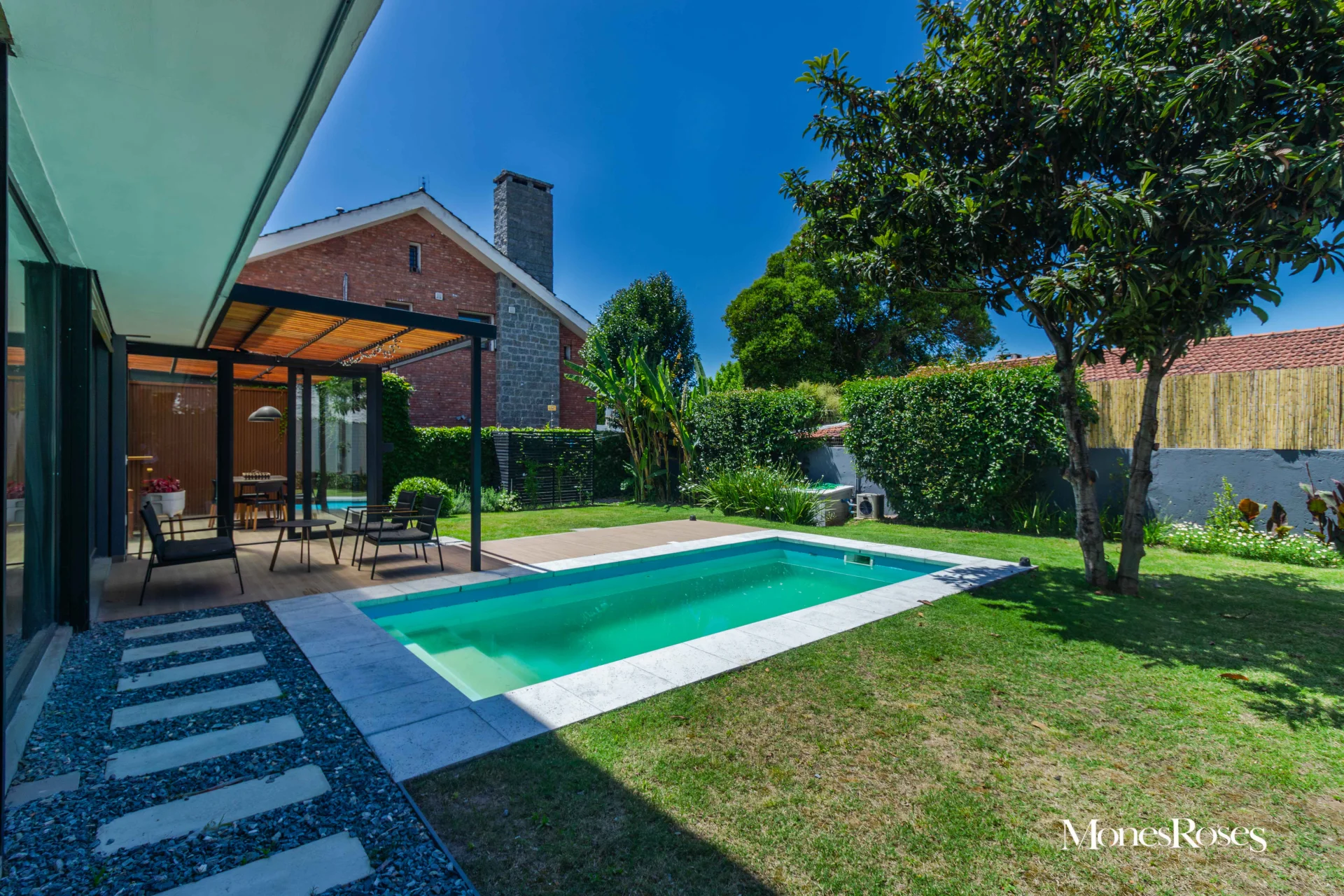Casa moderna, minimalista en Carrasco Sur, 2 plantas. Living comedor con estufa a leña alto rendimiento, ambiente amplio, pisos porcelanatos, y todo con salida al fondo. Cocina divina, integrada a la recepción. Toilette. 4 dormitorios. En p.b.: 1 dormitorio (o escritorio) y 1 baño completo. En p.a.: 3 Dormitorios, 2 baños, suite, vestidor. Calefacción central por losa, y agua caliente por caldera a gas. Aires acondicionados. Gran fondo verde, con piscina climatizada y deck y parrillero techado, muy linda área social exterior, para disfrutar del fondo. Pasaje lateral. Garage. Alarma, seguridad. Todo impecable y nuevo. INMOBILIARIA MONES ROSES *** - ***VISITE NUESTRA WEB MONESROSES.COM POR MAS FOTOS Y PROPIEDADES