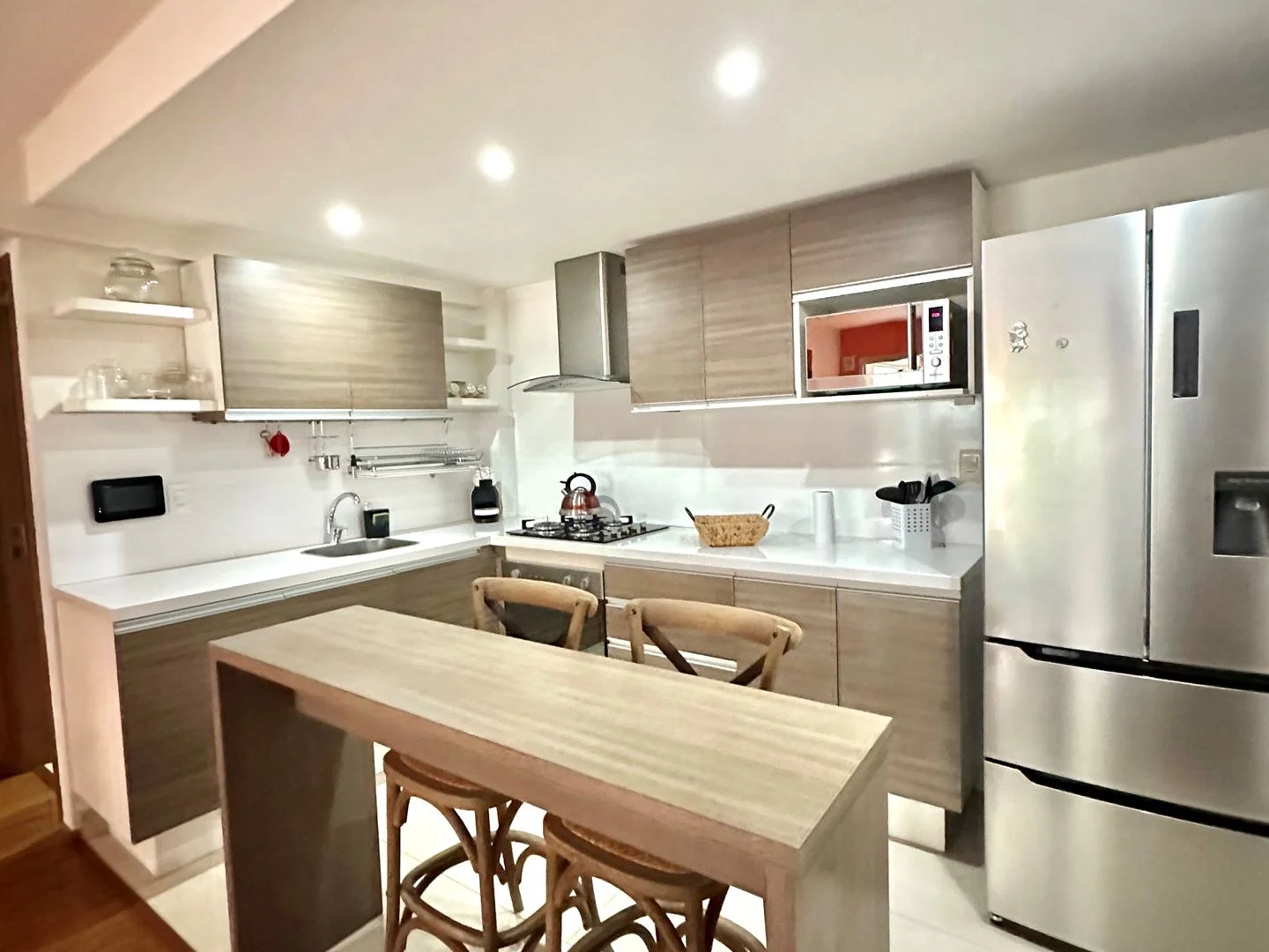 Cocina amplia integrada con todos lo necesario para cocinar.-