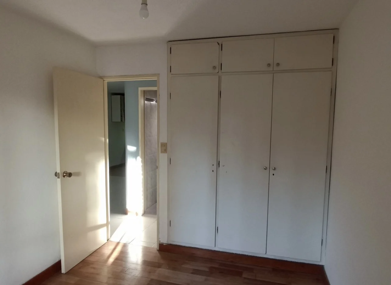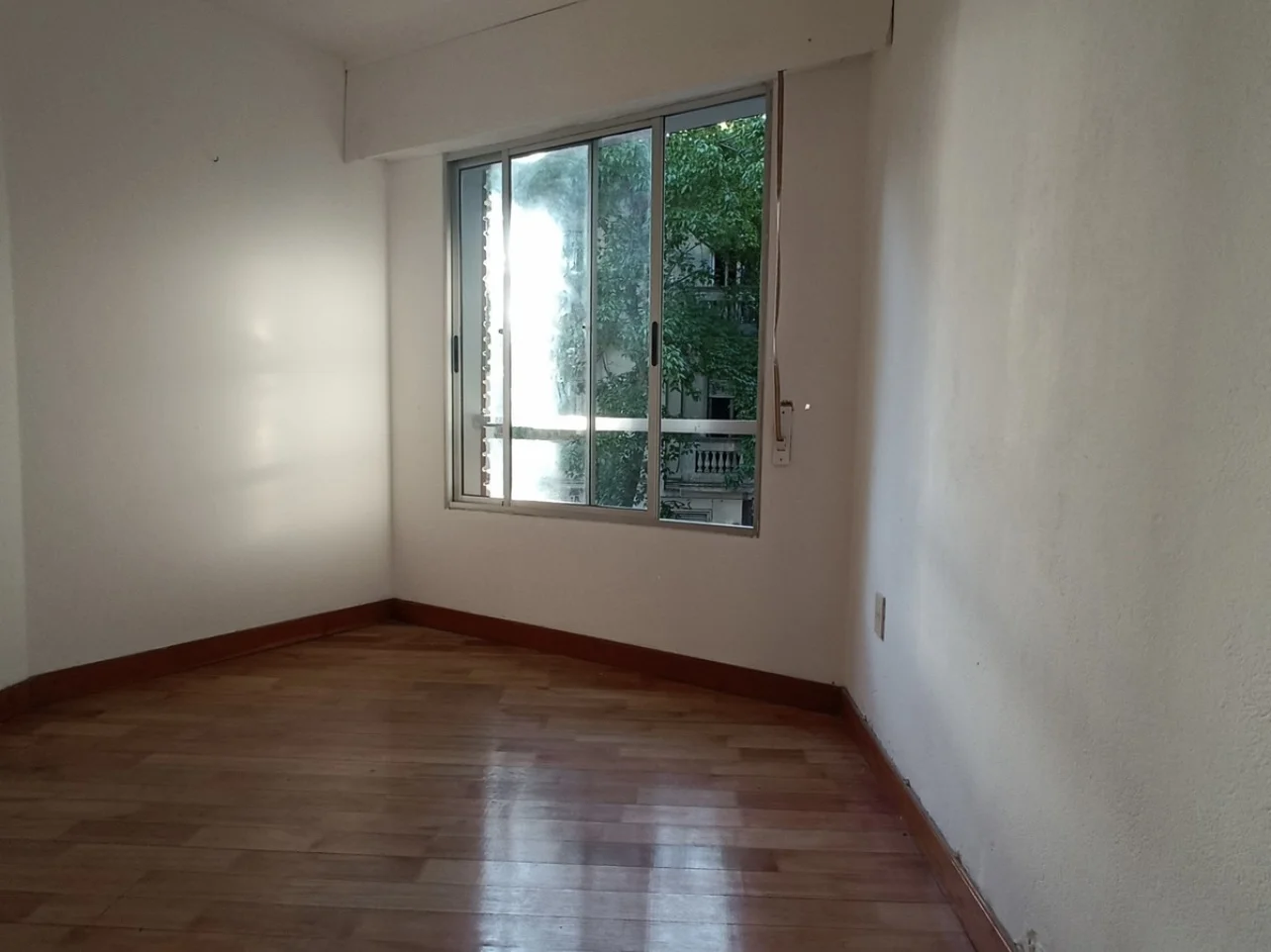 Dormitorio con ventana al frente, placard y piso de madera plastificado a nuevo.