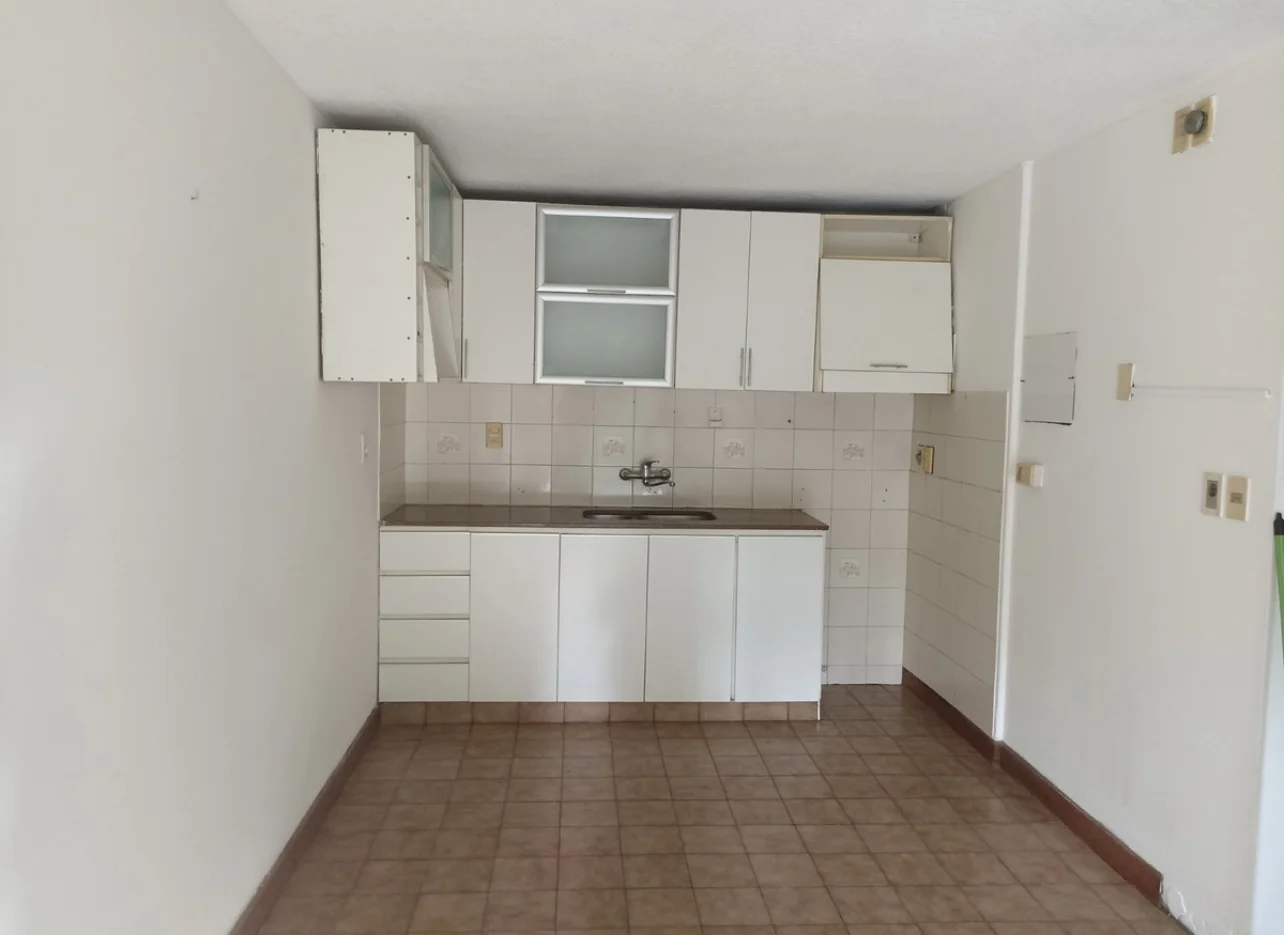 Cocina con placares sobre y bajo mesada, integrada al living comedor.