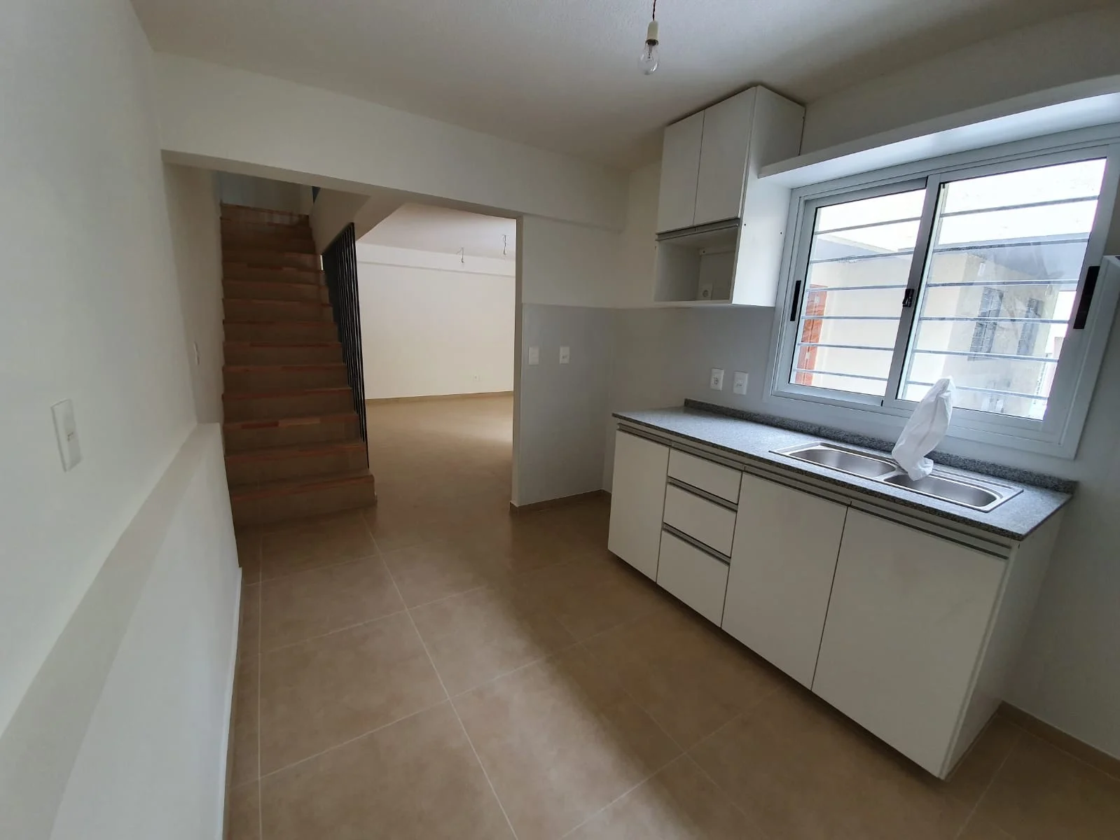 -En planta baja living comedor con cocina integrada con muebles aereos y bajo mesada