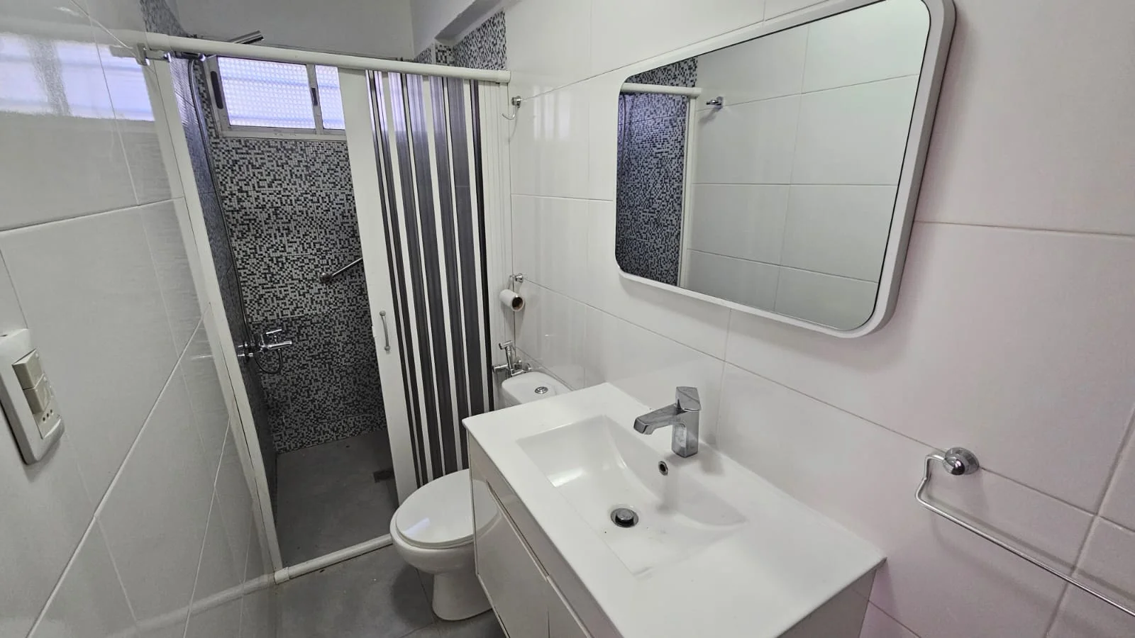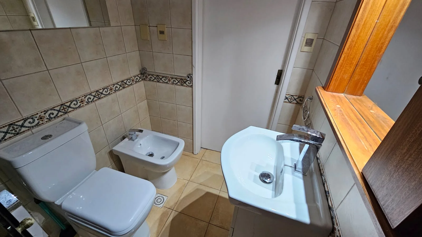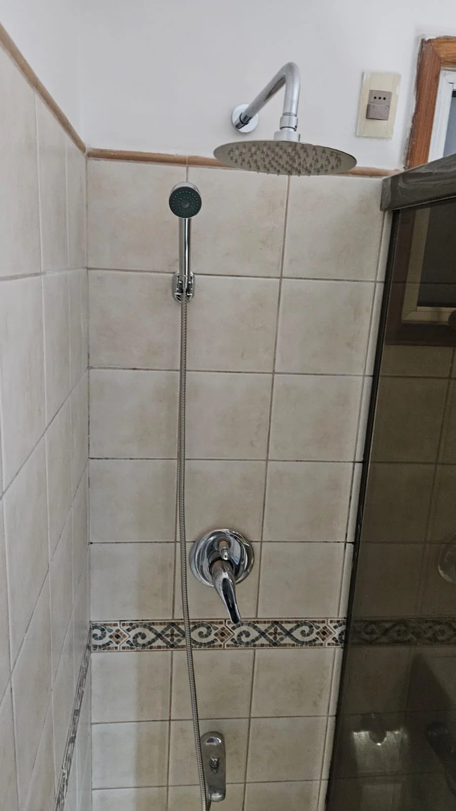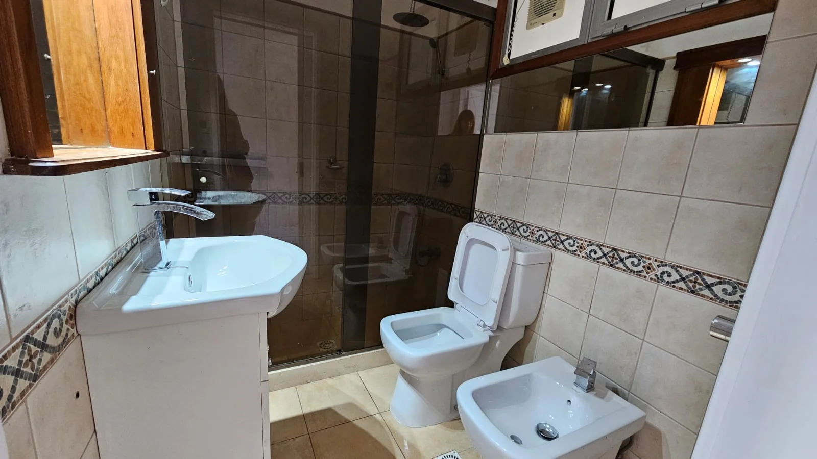 • Baño completo con mampara, botiquín espejo y extractor. Roseta ancha vertical y ducha de mano.