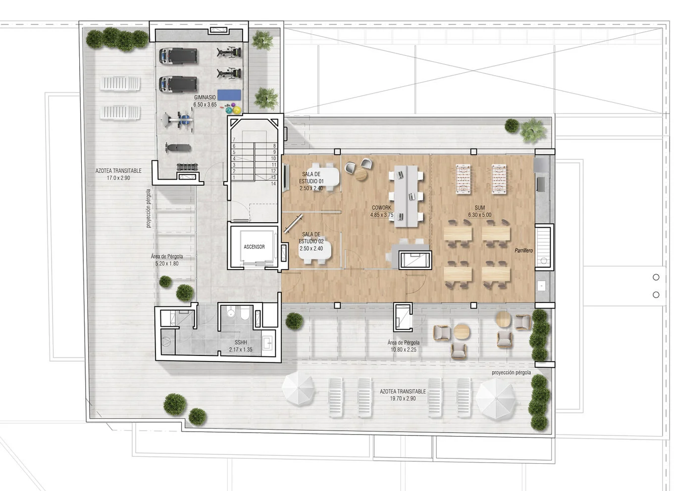 Amenities: Salas de estudio, espacios de trabajo, parrillero, gimnasio y solárium.