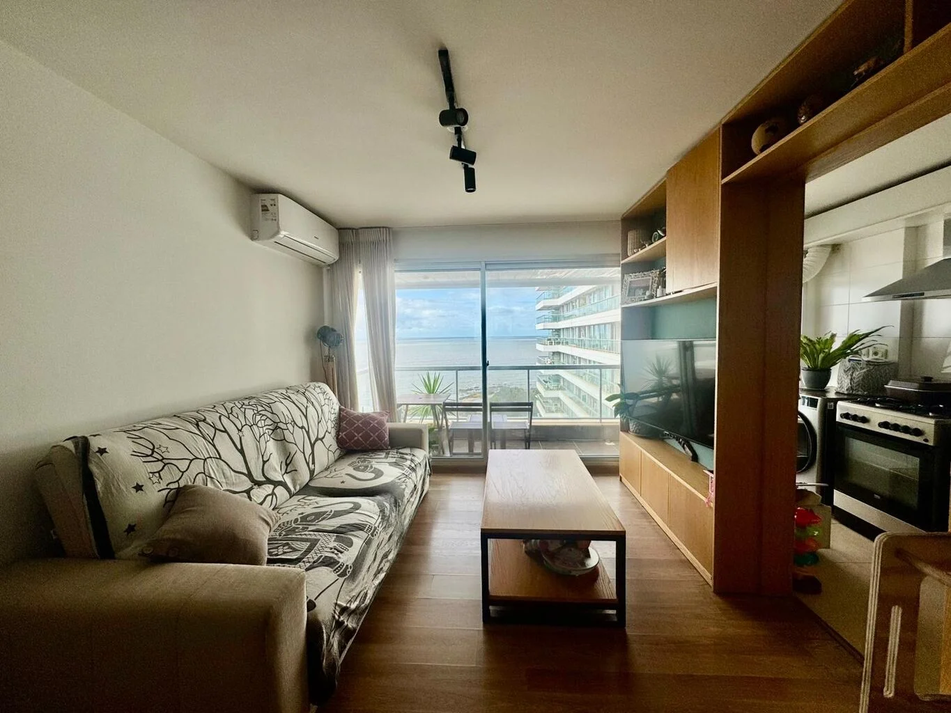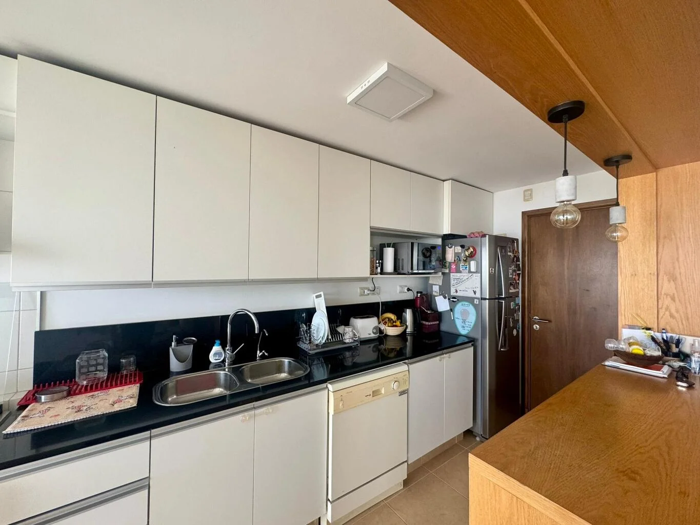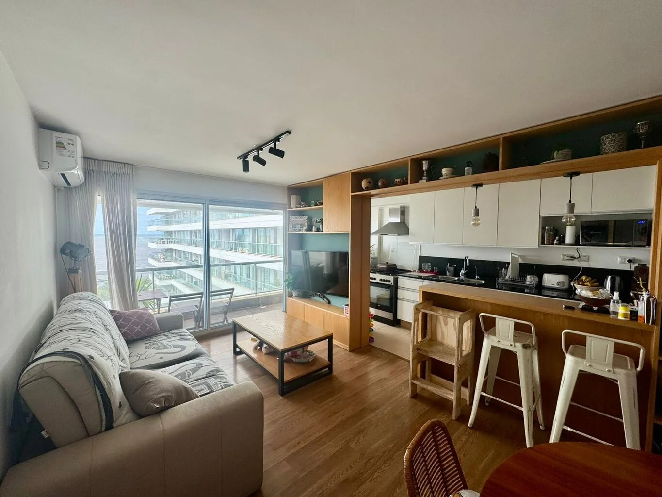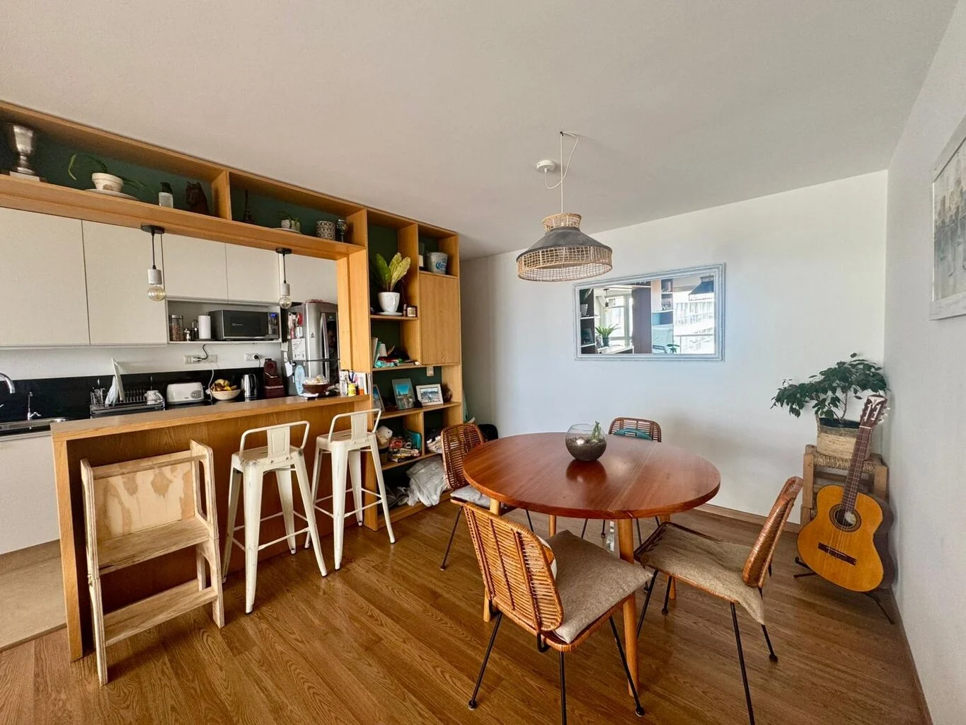 Desarrolla living comedor con acceso a balcón, cocina definida semi integrada al ambiente social con gran profusión de placares y excelente mesada de madera con estantes super funcional.