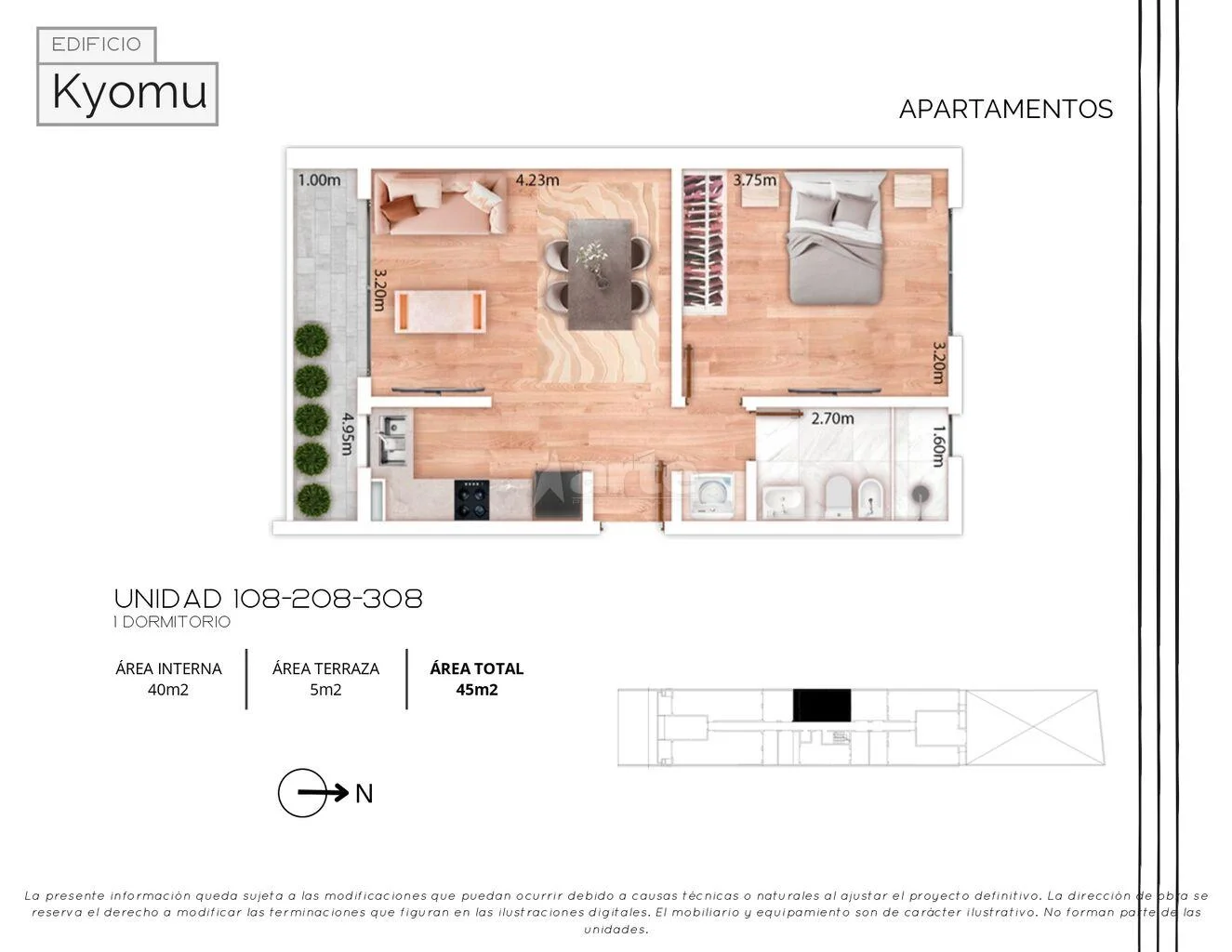 Muy cómoda planta con living comedor con salida a cómodo balcón, cocina integrada que se entregará muy bien equipada de anafe, horno empotrado y campana de extracción de humo.