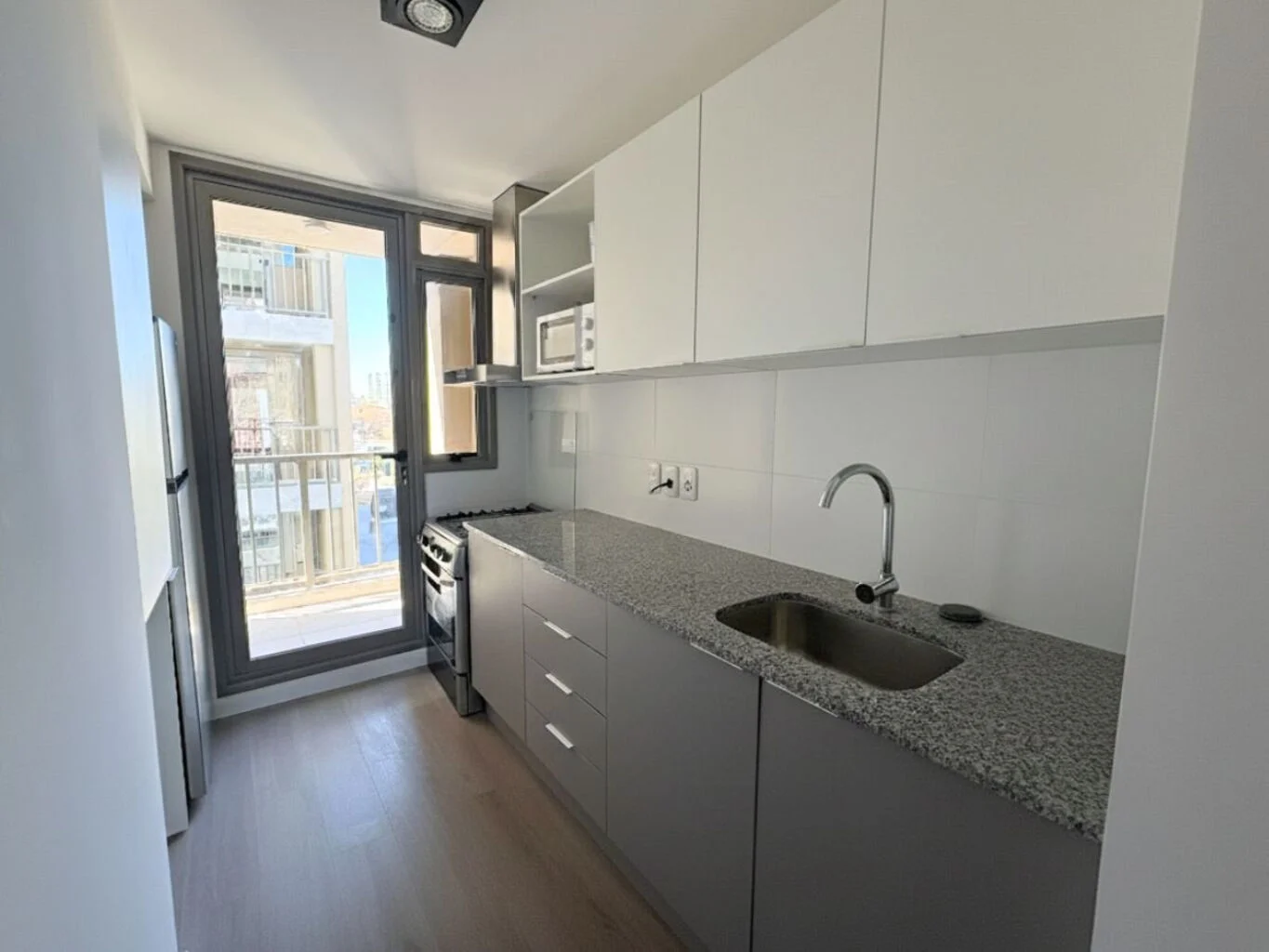 Cocina definida con mobiliario bajo mesada, bacha con topes de granito y campana