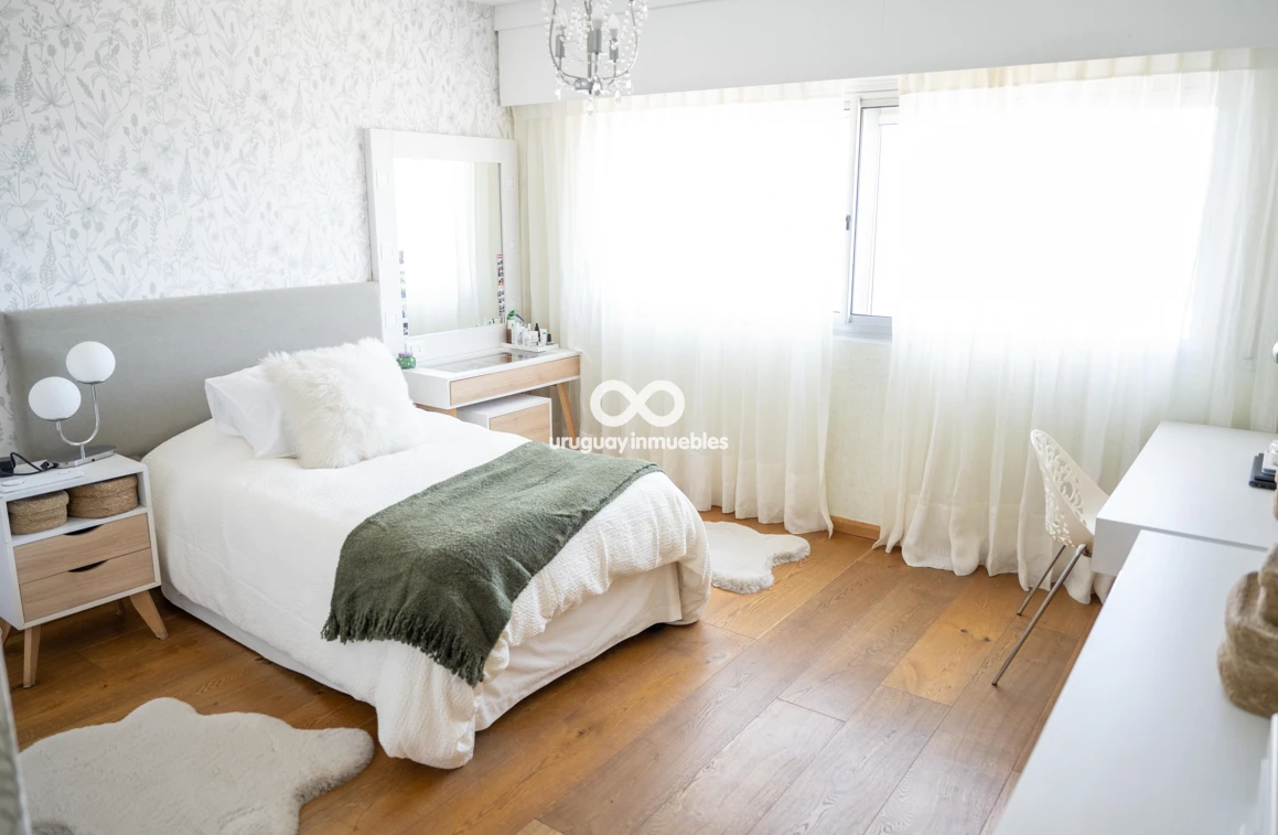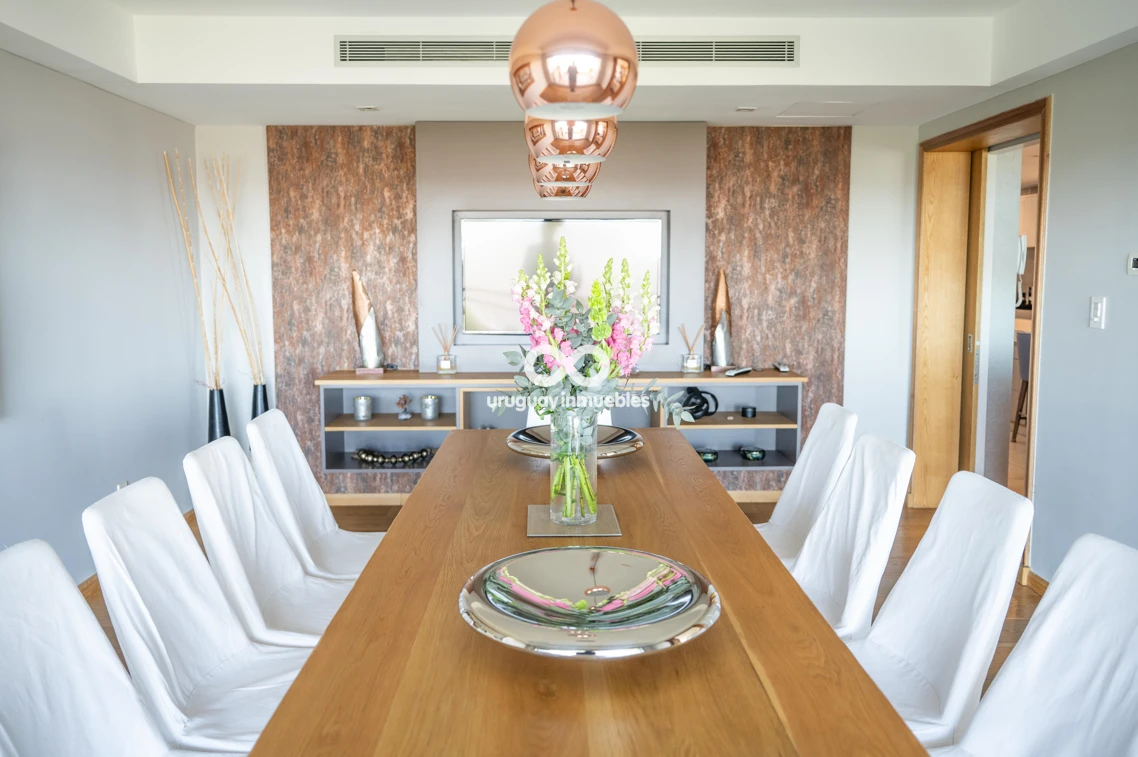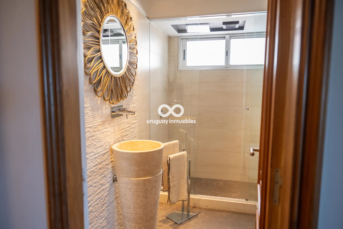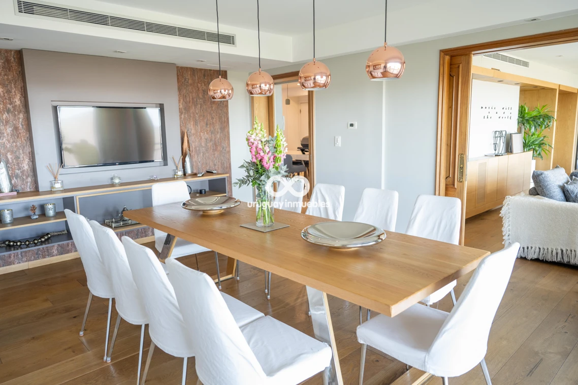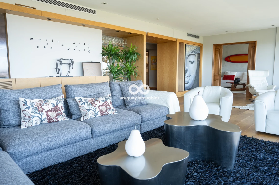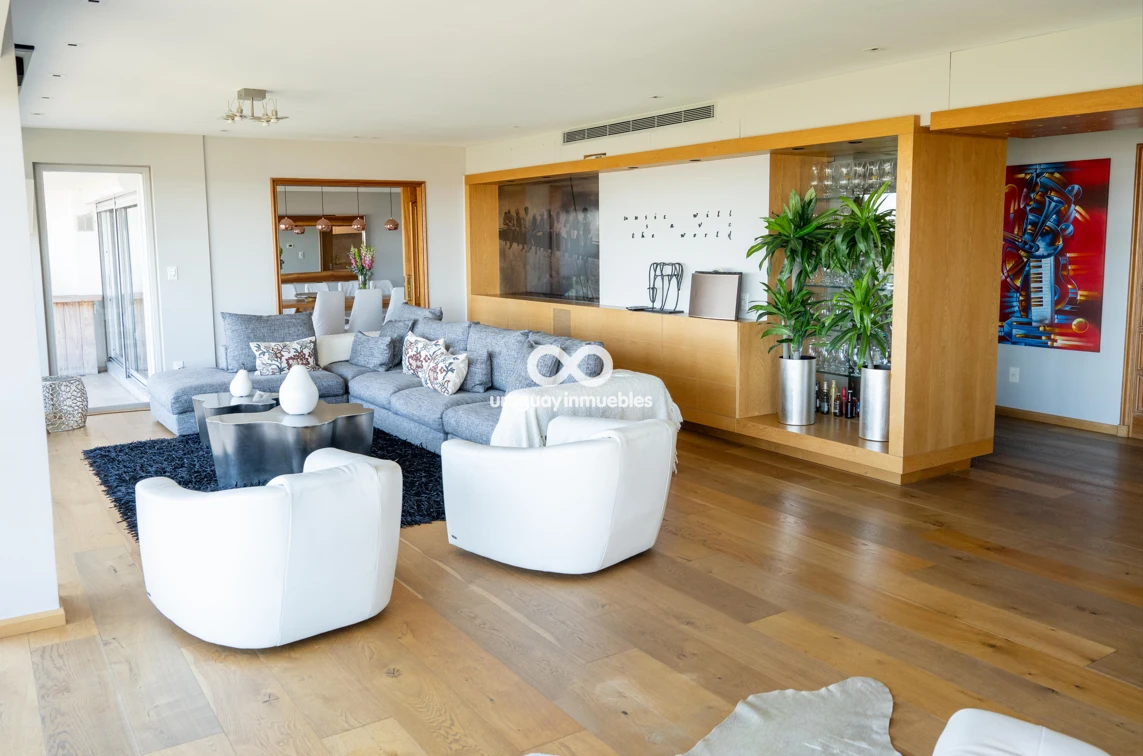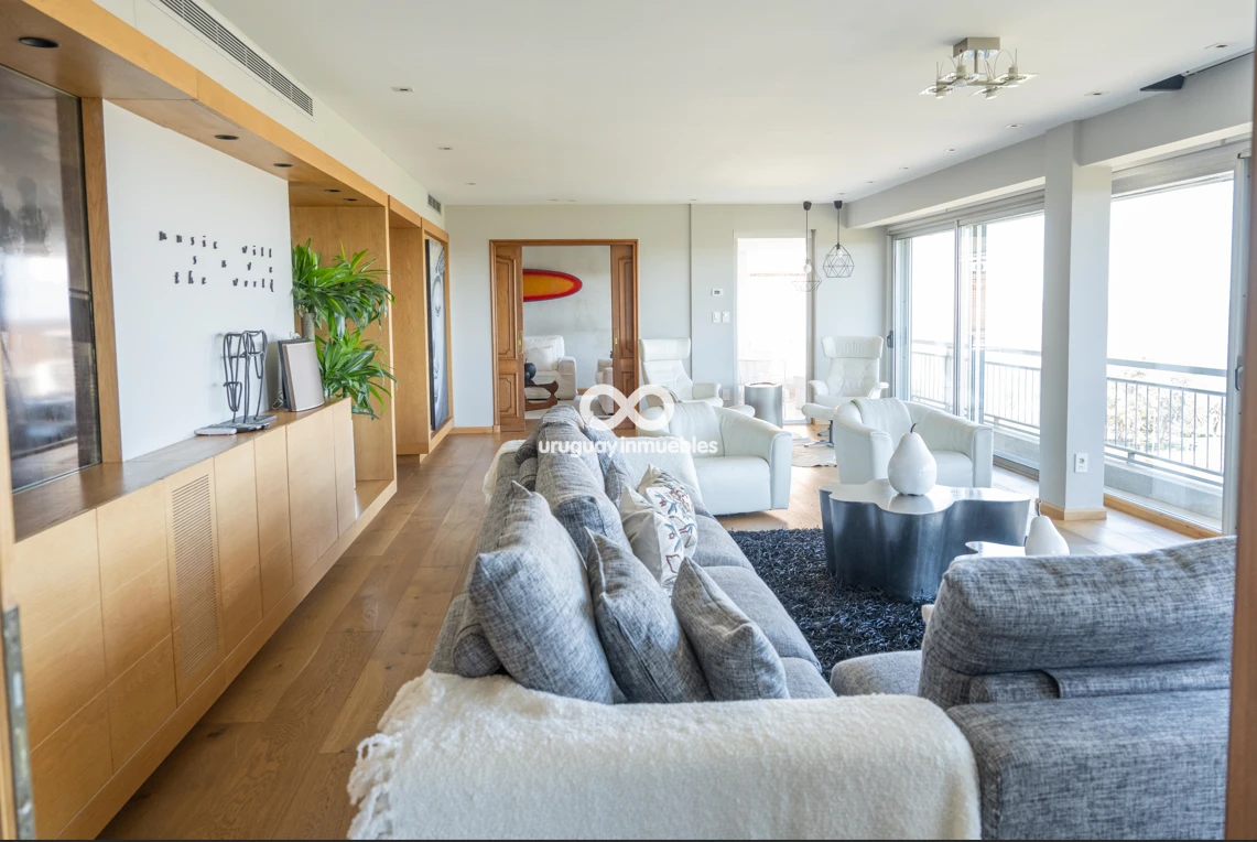 Espectacular apartamento en venta con privilegiadas vistas al Golf y al mar. Sólida planta de 330 m², muy luminosa y soleada, con amplios ambientes. Cuenta con entrada principal y de servicio, lo que permite una cómoda doble circulación que separa el área social del área íntima. Al ingresar, nos recibe un elegante living central, que se comunica con un estar y un comedor. Todos estos ambientes se orientan hacia el frente y cuentan con acceso a una amplia terraza con vistas panorámicas al Golf y al mar. En esta área también se encuentran un baño social y una amplia cocina de diseño moderno, equipada con una gran isla central y múltiples placares que brindan excelente capacidad de guardado. Además, dispone de terraza lavadero y completa dependencia de servicio. En el área íntima, un hall de distribución conduce a cuatro dormitorios. El dormitorio principal en suite cuenta con vestidor y un baño de generosas dimensiones. Los otros tres dormitorios comparten un baño completo, todos con excelente iluminación natural y muy buenas dimensiones. La propiedad está equipada con aire acondicionado central en el área social y en la cocina, además de splits individuales en cada dormitorio. Cuenta también con calefacción por losa radiante con sensores de temperatura sectorizados en tres áreas del apartamento, y sistema central de agua caliente. La tecnología también está presente mediante sistema de domótica, cortinas automatizadas, doble ventana y persianas en todos los ambientes, aportando mayor confort y eficiencia. Incluye dos garages independientes, box de guardado y bicicletero en planta baja. El edificio ofrece seguridad 24 horas con portería permanente y sistema de videovigilancia (CCTV).
