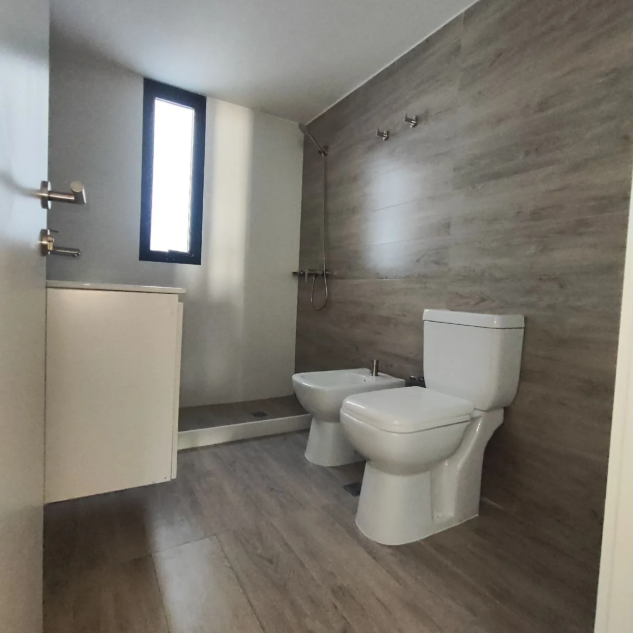 Moderno baño con conexión para lavarropas y calefón dentro de un mueble.