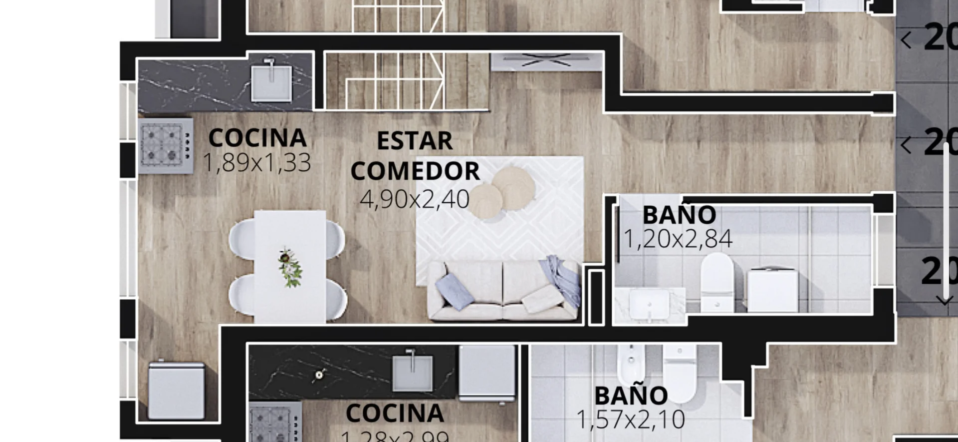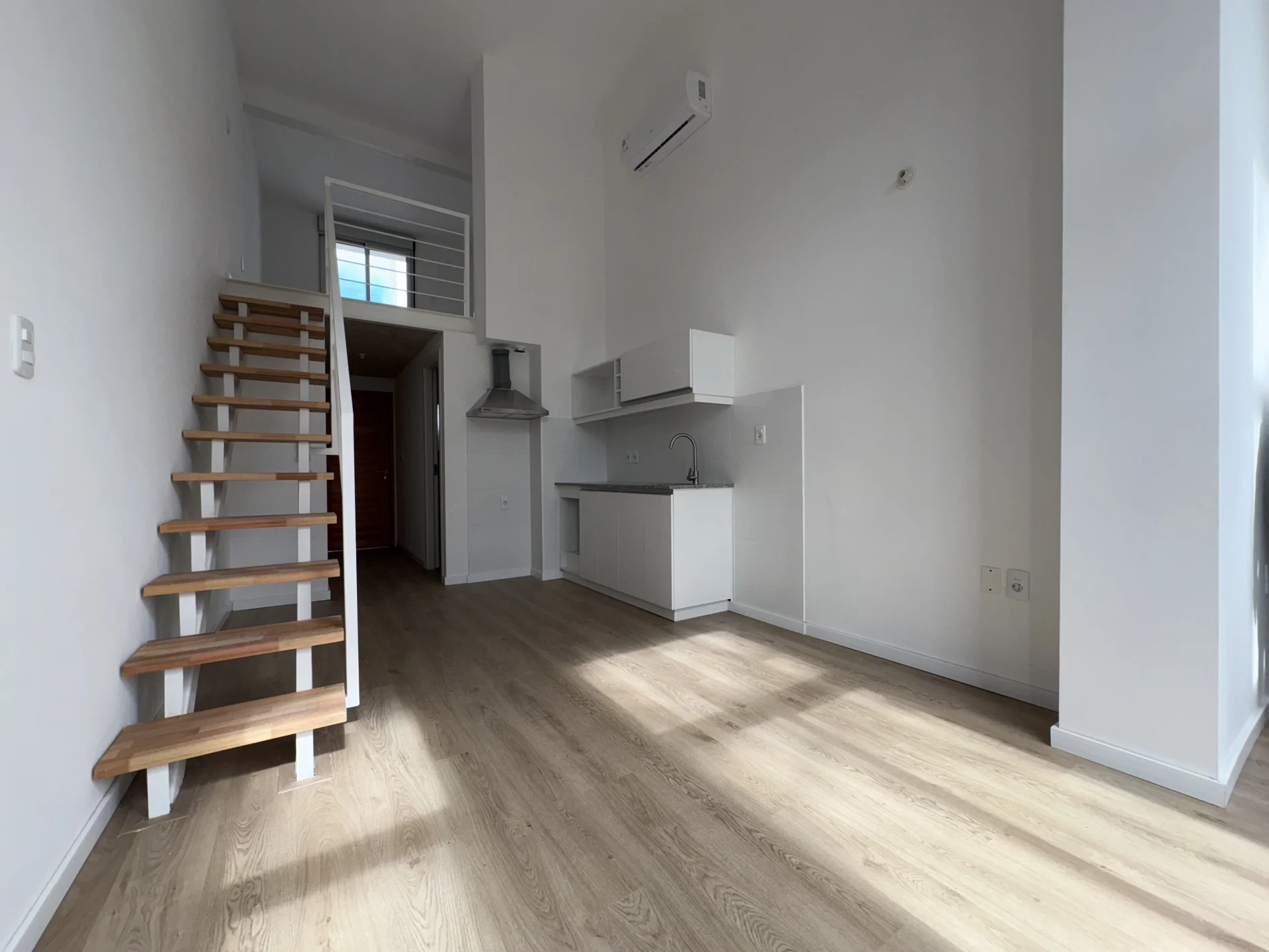 El apartamento se desarrolla en 2 plantas, cuenta en planta baja con living comedor con cocina integrada, cómodo baño, y espacio para escritorio. En planta alta cuenta con dormitorio.