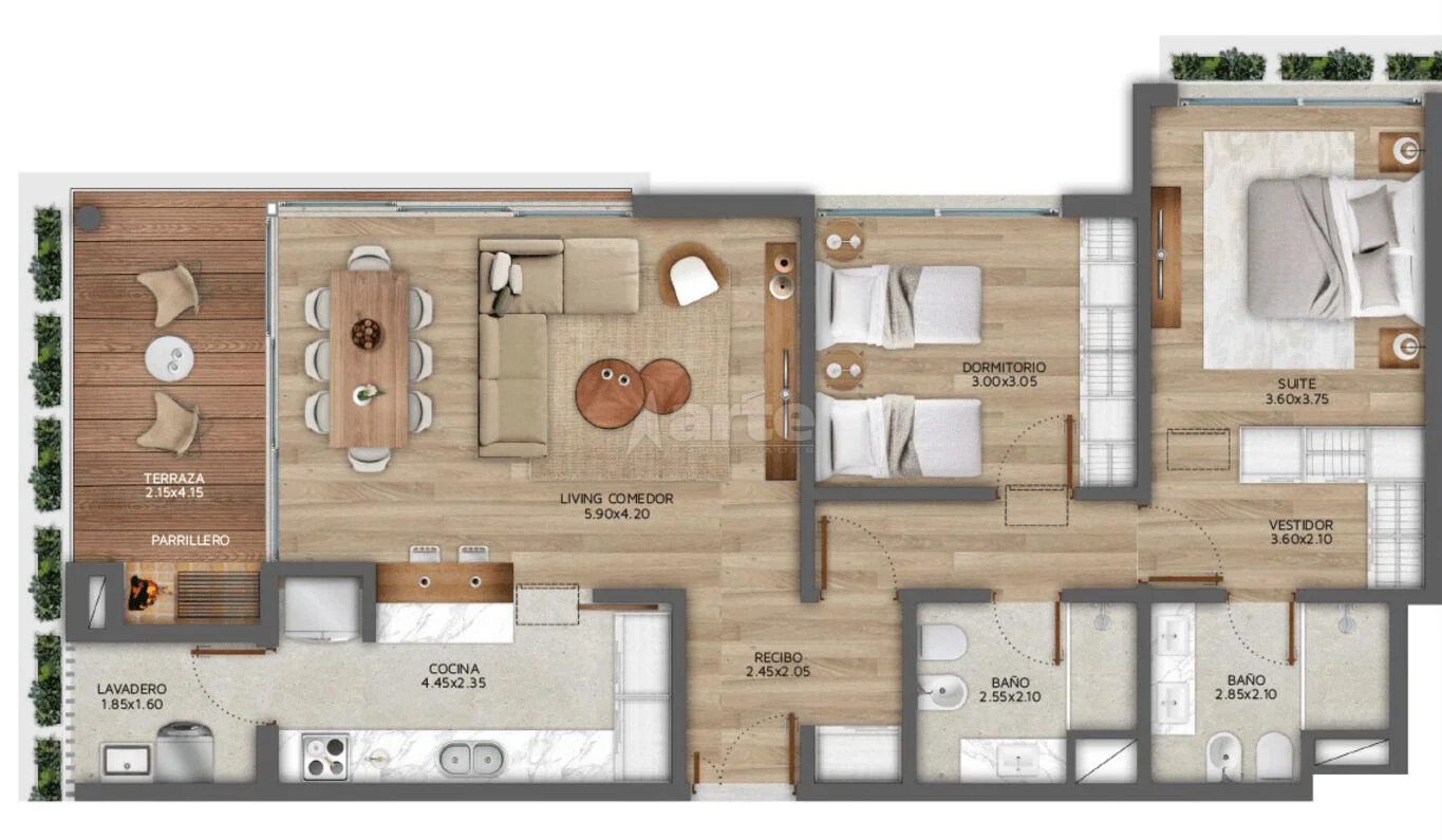 Unidad muy amplia esquinera con doble orientación divina terraza exclusiva con parrillero, 2 dormitorios muy cómodos con muy buenos placares de alta calidad, la suite con vestidor y hermosa cocina definida con su terraza lavadero.