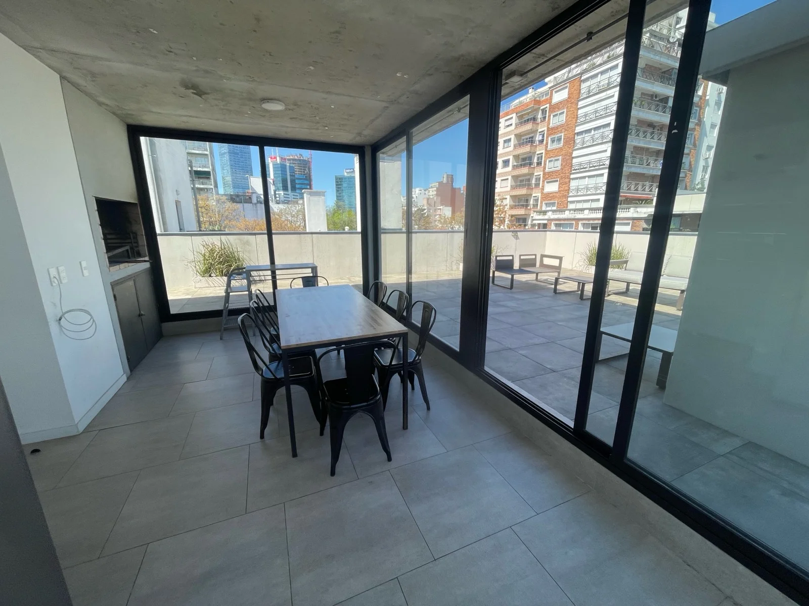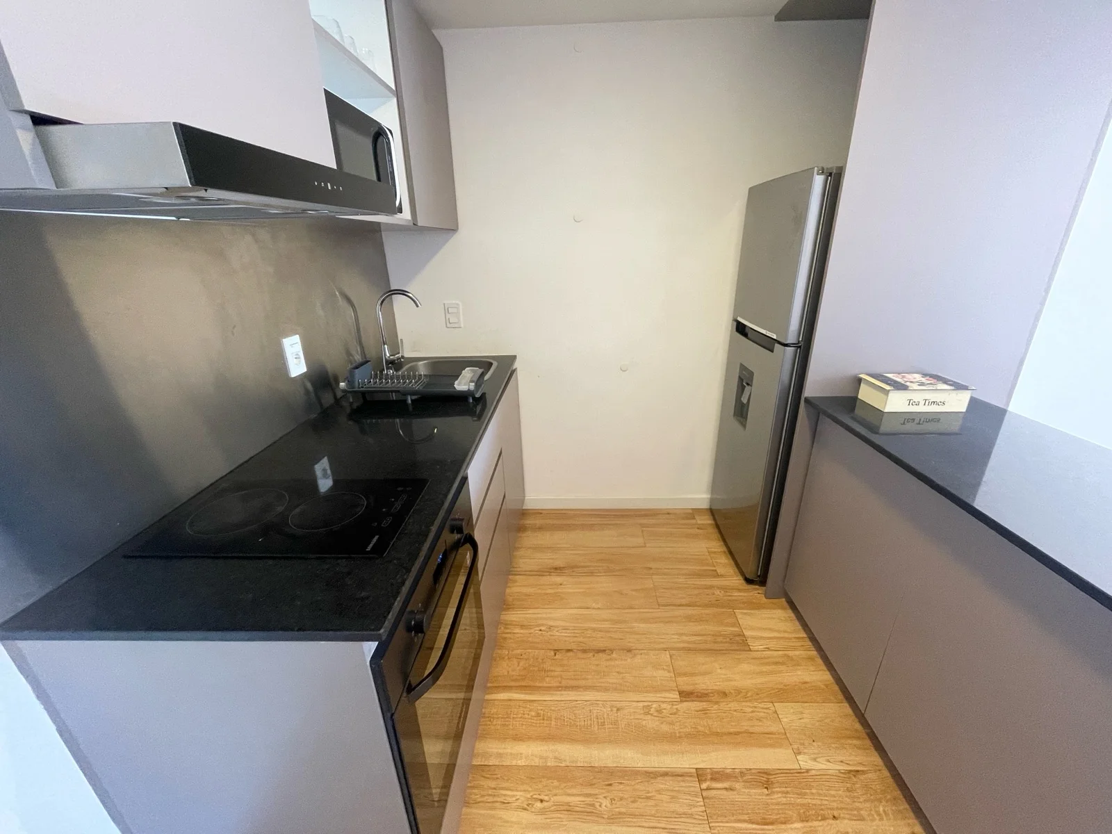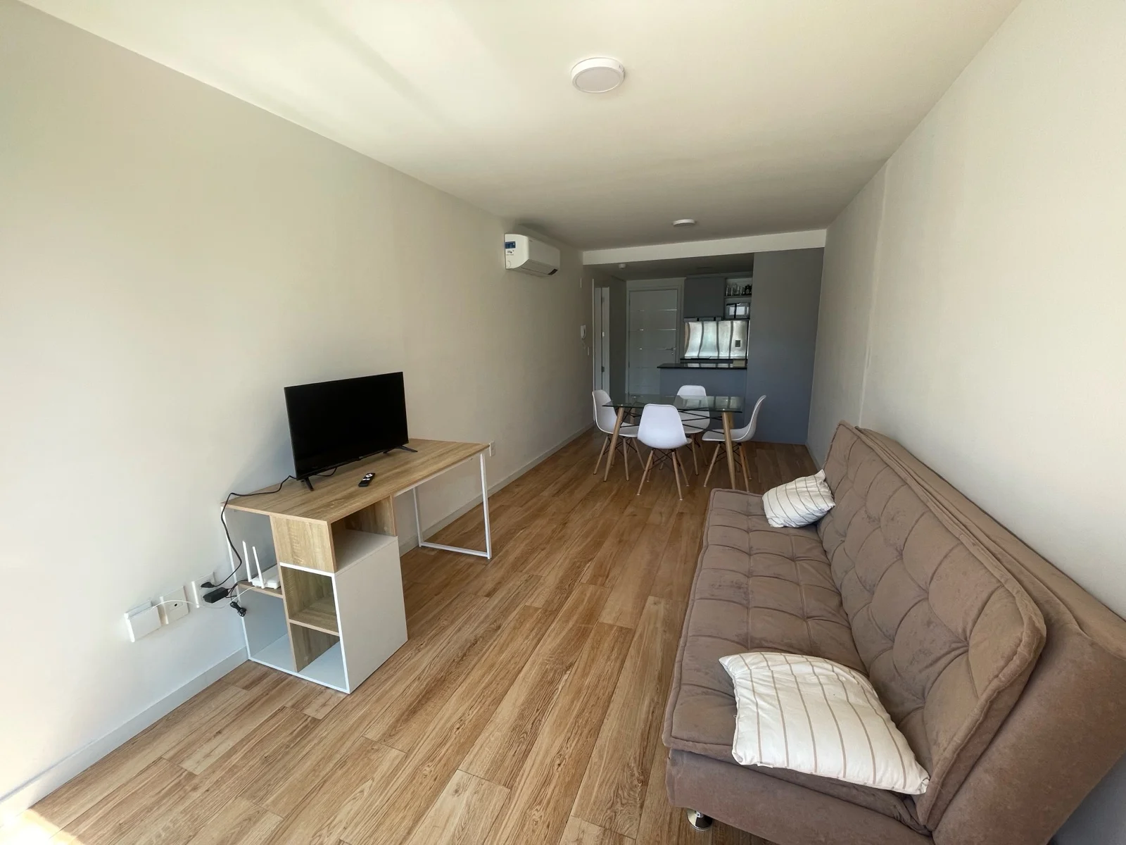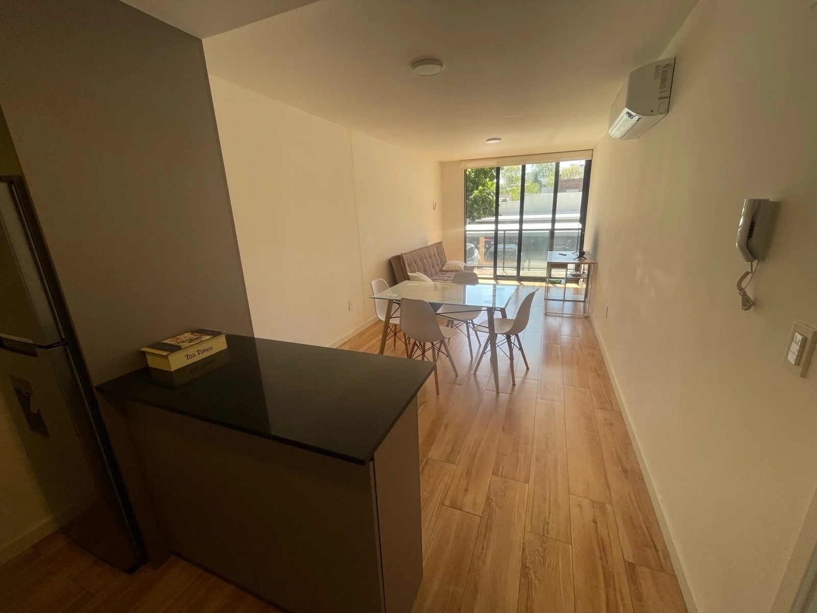 El dormitorio incluye un vestidor, brindando un espacio práctico y organizado. Cuenta con Aire Acondicionado. El baño está diseñado con una elegante mampara, aportando modernidad y confort. El apartamento también cuenta con pisos de porcelanato.