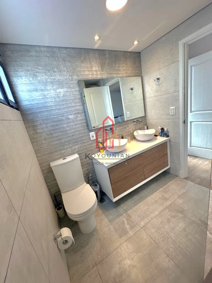 . Baño completo moderno con doble pileta, grandes espejos, placard y luz natural.