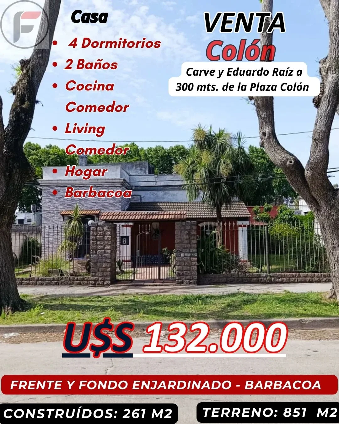 Detalles del inmueble Código: ***Zona: Colón Dirección: CARVE Tipo de inmueble: Casa Área Construida: 261 M2 Área Terreno: 851 M2 Alcobas: 4 Baños: 2 Garaje: 2 Estado físico de la propiedad: Usado Año construcción: 1957 Venta: US$132.000 Descripción detallada No te podes perder la OPORTUNIDAD. Construcción antigua y sólida. Precisa que se le realicen reparaciones. Sobre la calle Carve en esquina con Eduardo Raíz, a 300 mts. de Plaza Colón y 200 de Av. Garzón. Todos los servicios, liceos, escuelas, comercios y transporte público a pocos metros. Construcción de 261 m2 Terreno de 851 m2 Living Comedor c/estufa a leña. Comedor Diario doble c/estufa a leña. 4 Dormitorios (3 en planta baja y 1 en planta alta) 2 Baños (1 completo y moderno en planta baja con conexión para lavarropas y otro en planta alta moderno pero sin funcionar). Barbacoa. Galpón con espacio para autos. Pieza de usos multiples. Frente enjardinado con acceso vehicular y otro peatonal, con reja y portón. Entrada lateral para vehículos. Fondo enjardinado con plantas y árboles. Rodeado por muro perimetral. CONTRIBUCION: $ 12.000 PRIMARIA: $ 5.000 PRECIO DE VENTA: U$S 132.000