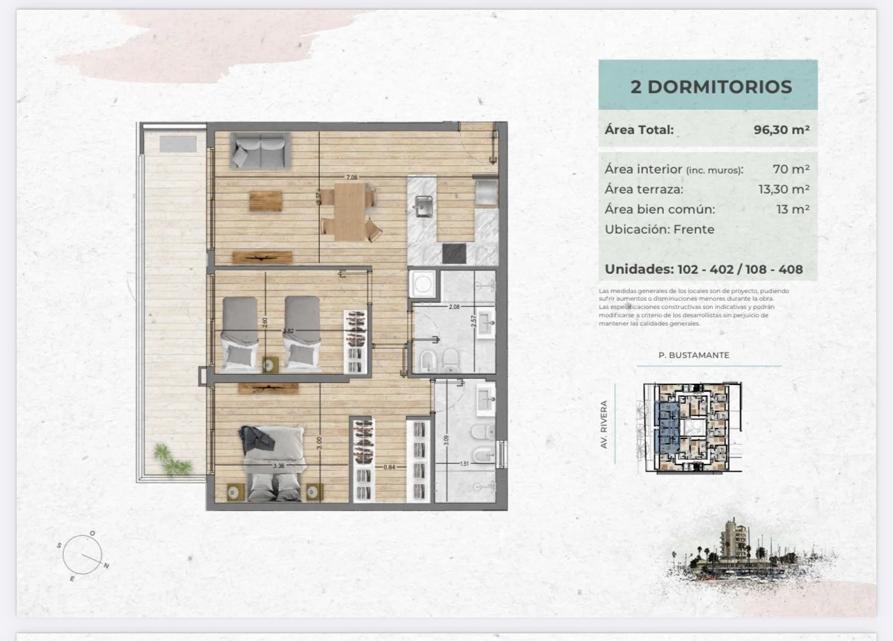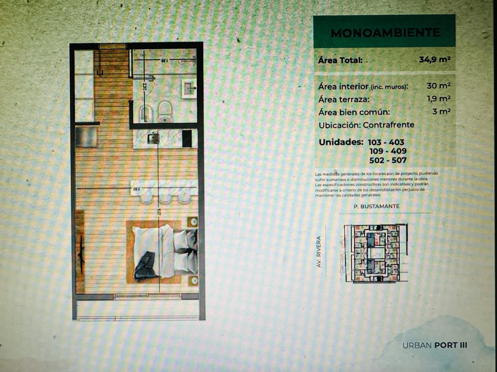 Descubra URBAN PORT III, un proyecto excepcional en el corazón de Pocitos Nuevo, uno de los barrios más codiciados de Montevideo. Ubicado estratégicamente en Av. Rivera y Pedro Bustamante, este desarrollo le ofrece la oportunidad de vivir a pocas cuadras de la Rambla, rodeado de una vibrante oferta de servicios, comercios, tiendas exclusivas, supermercados, centros comerciales, bancos, instituciones educativas y parques. URBAN PORT III presenta una selecta colección de apartamentos monoambiente y de 1 y 2 dormitorios, diseñados con amplios metrajes y terrazas privadas para maximizar su confort y bienestar. Este edificio ha sido concebido para ofrecer una experiencia de vida superior, con características y amenities de primer nivel: * **Recepción, Vigilancia y Seguridad:** Infraestructura y equipamiento de vanguardia para implementar un servicio de recepción y vigilancia, ya sea personal o remoto, complementado por un circuito de cámaras de seguridad para su tranquilidad. * **Garaje:** Cocheras individuales en planta baja, junto con servicios generales como baño de servicio y depósito. * **Laundry:** Sala equipada con máquinas lavarropas y secarropas de uso colectivo, mediante un práctico sistema de fichas. * **Portero Eléctrico:** Sistema de portero eléctrico y telefonía interna centralizada para una comunicación eficiente. * **Portones Automáticos:** Acceso al edificio y al garaje mediante portones y/o cortinas automatizados, controlados por remoto y tags, garantizando seguridad y comodidad. * **CCTV:** Circuito cerrado de cámaras de vigilancia estratégicamente ubicadas en accesos, cerco perimetral y áreas comunes exteriores. * **Bicicletero:** Espacios individuales y/o colectivos en el garaje para el resguardo seguro de bicicletas. * **Barbacoa:** Un elegante local cerrado en la azotea, completamente equipado con parrillero y mobiliario de diseño (sillas, mesas, sillones), ideal para sus reuniones sociales. * **Solárium:** Una terraza solárium acondicionada en el rooftop, perfecta para el esparcimiento y la recreación al aire libre, disfrutando de vistas privilegiadas. Aproveche esta oportunidad única: Apartamento Monoambiente en piso 3 (unidad 303 - contrafrente) desde U$S 97.800.- Cocheras desde U$S 24.000.- La fecha estimada de entrega es AGOSTO del 2027. Facilitamos su inversión con un plan de pagos flexible: 10% reserva 30% compromiso de compra-venta 60% durante obra en cuotas trimestrales Gastos adicionales: 5% gastos de conexiones 3% + IVA comisión inmobiliaria. Para más información y para descubrir su próximo hogar, no dude en consultarnos. Somos Actitud Propiedades, su aliado en bienes raíces.