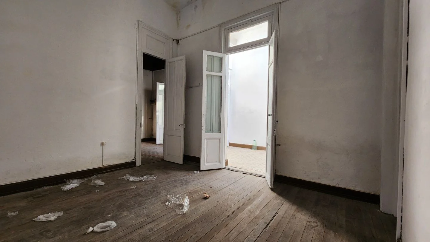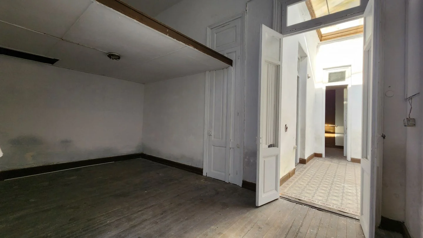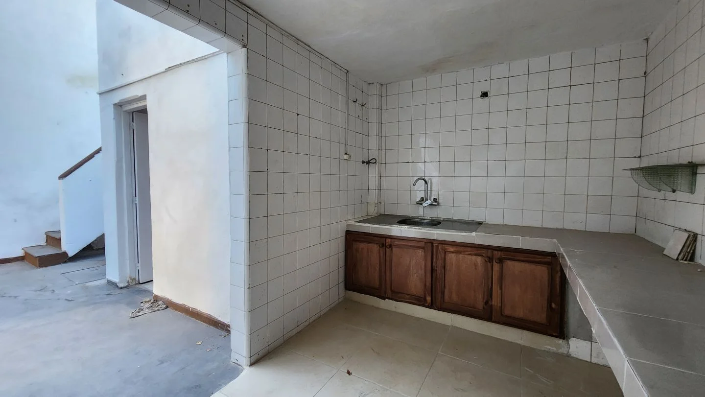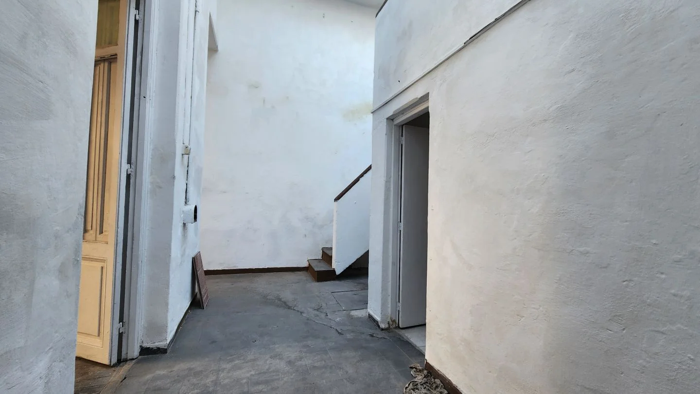 Casa con espacio central, cocina, baño completo, dos habitaciones en planta baja y altillo.