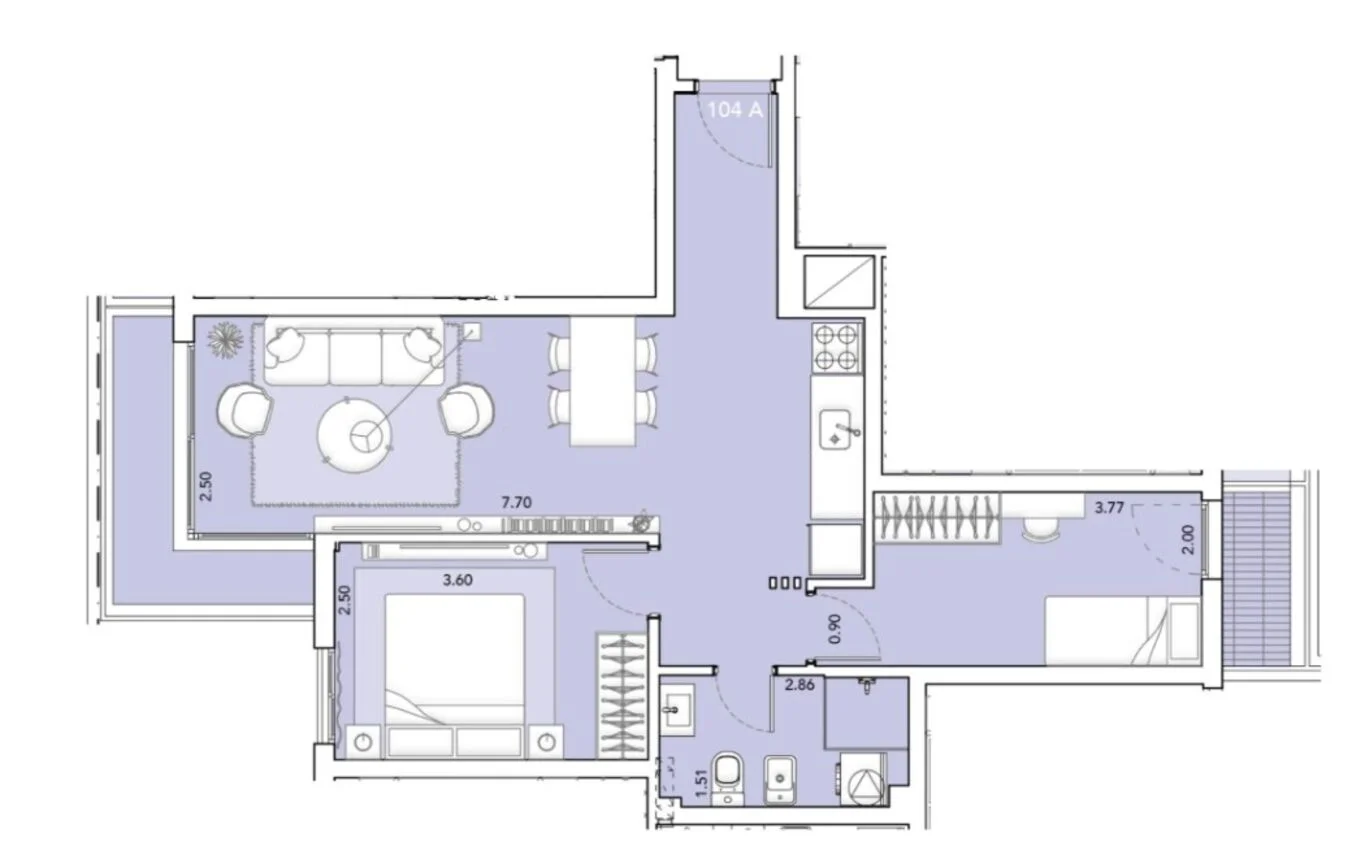Se ubica en el tercer piso por ascensor, en la Torre A y cuenta con una superficie total de 59 m2.