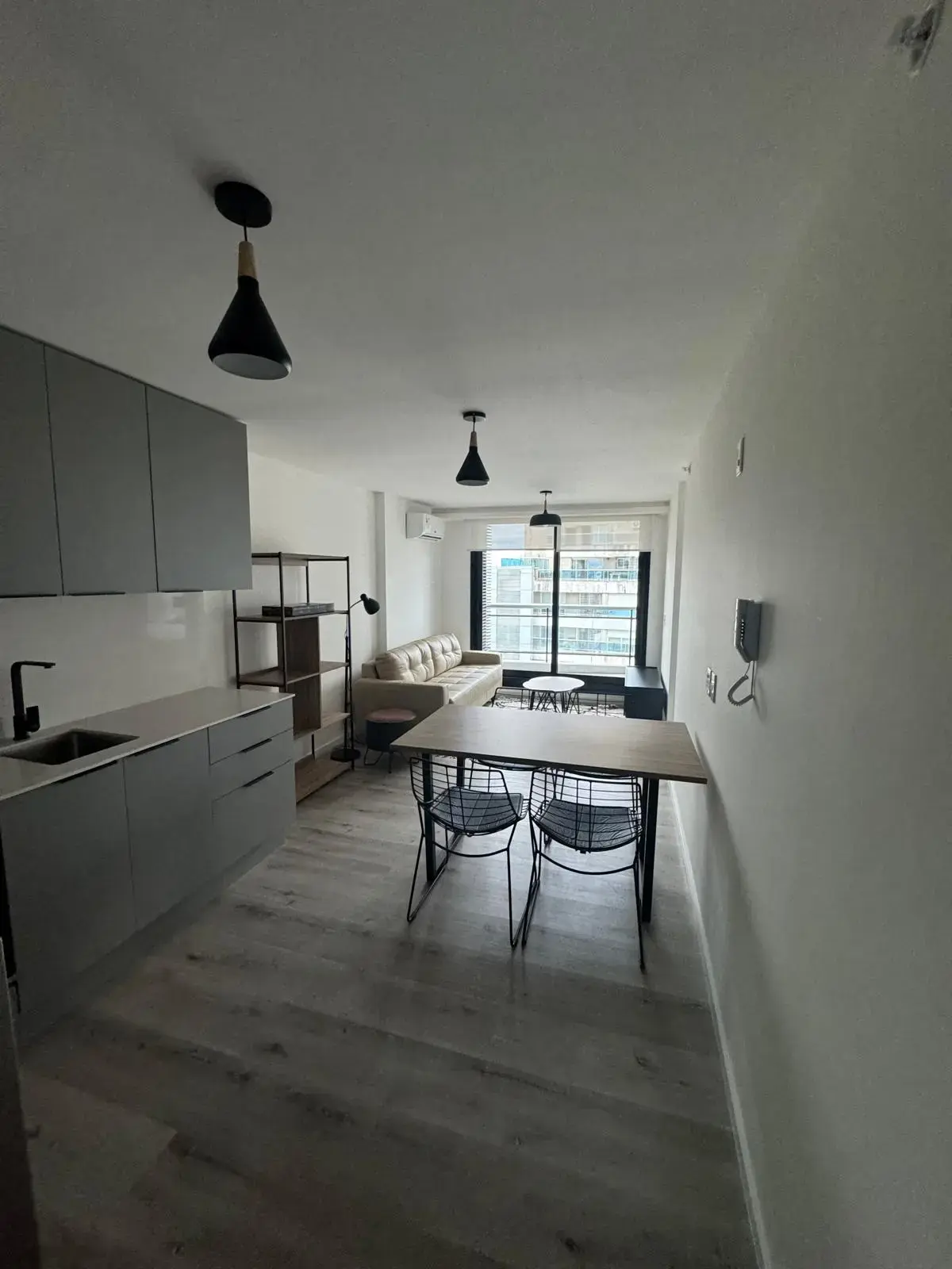Living comedor con cocina semiintegrada con salida a la terraza con vista lateral al mar