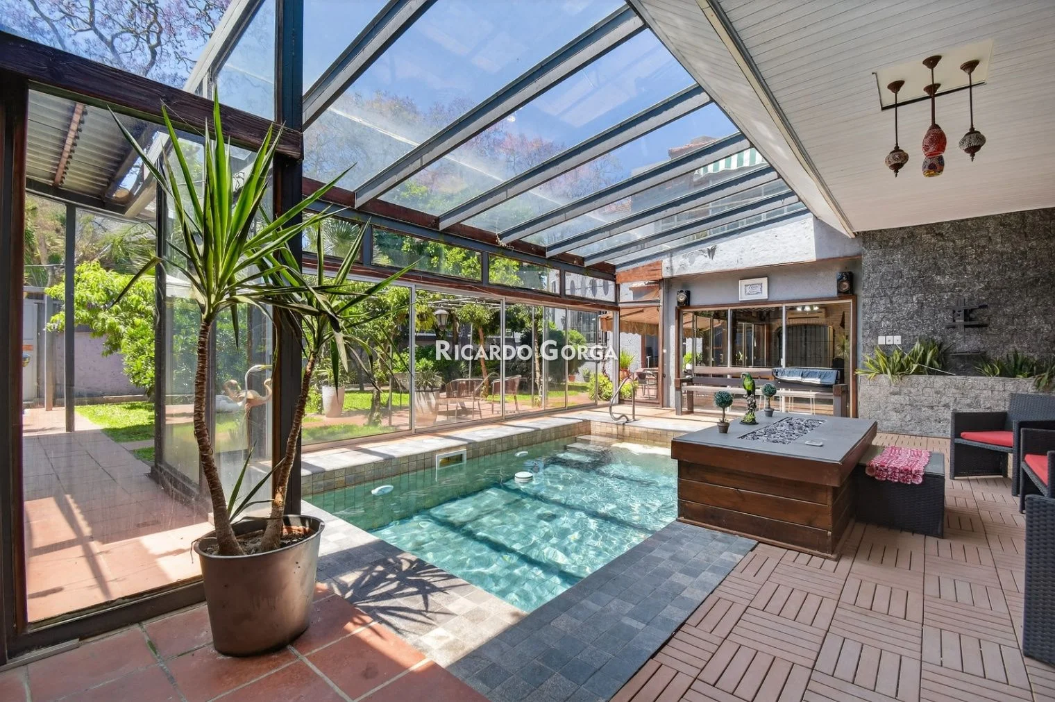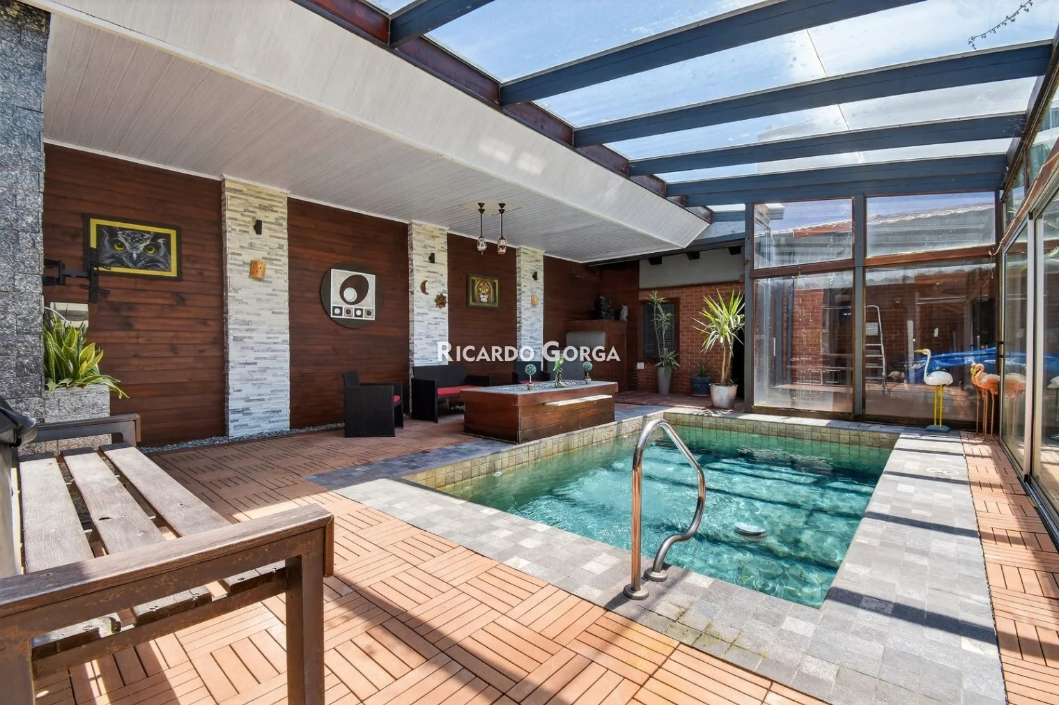 Piscina climatizada con cerramiento techo de vidrio y aberturas de aluminio. Paredes revestidas en madera y piedras con deck de madera