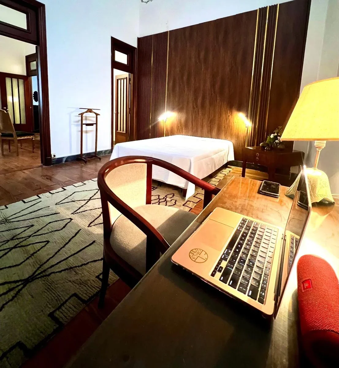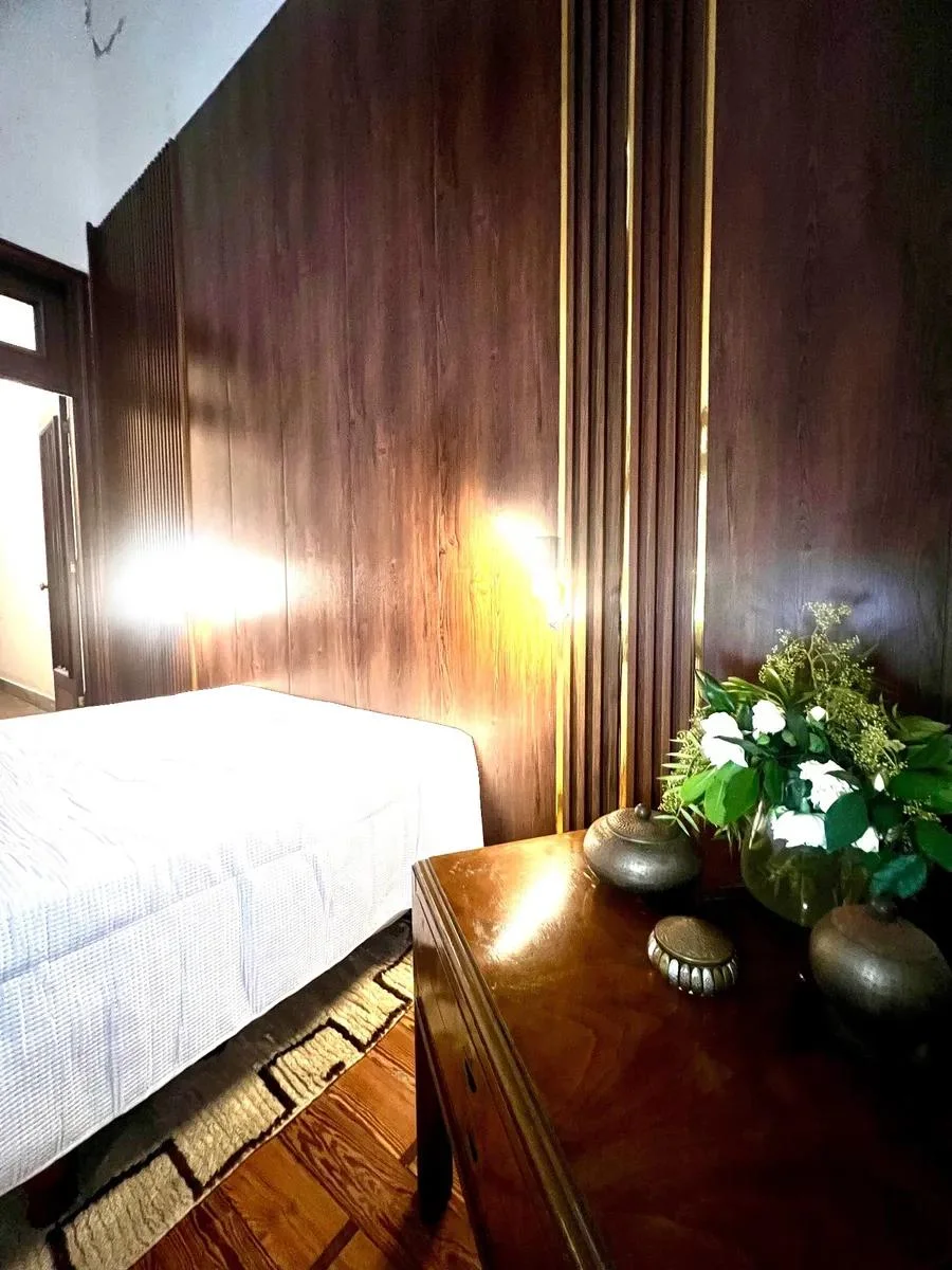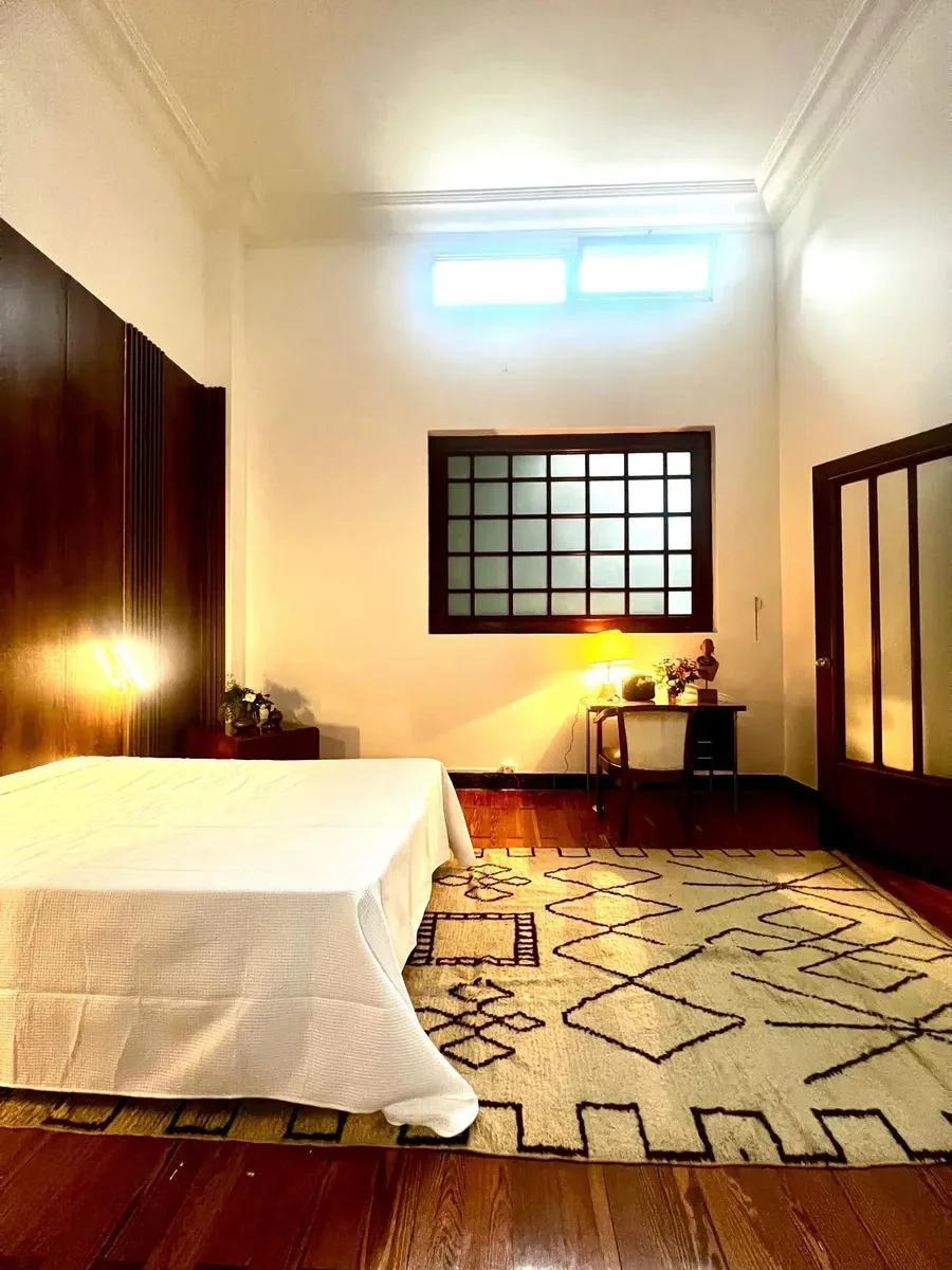 El dormitorio principal es amplio, luminoso y de gran calidez. Presenta una pared revestida en madera, luces empotradas de diseño y un elegante escritorio de estilo. La circulación entre el dormitorio y la cocina es fluida, generando un recorrido cómodo y funcional.