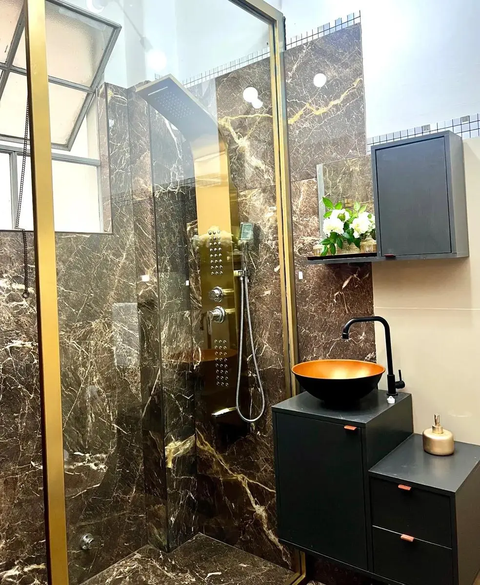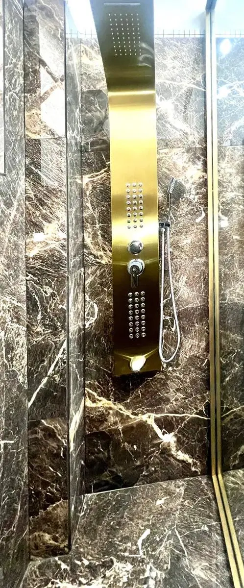 El baño es una verdadera joya de diseño: revestido en gres, con ducha escocesa, mampara de vidrio templado y grifería en símil bronce, logrando un ambiente sofisticado y confortable.
