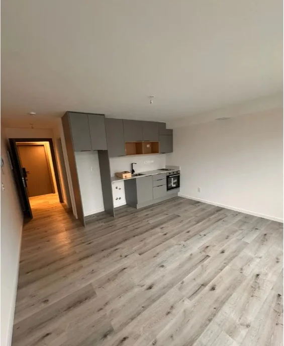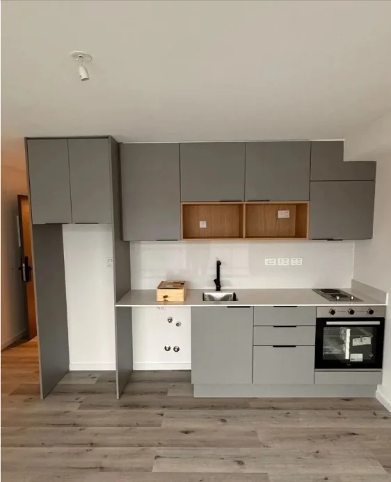 Cocina integrada con muebles aéreo y bajo mesada, horno empotrado, anafe, campana y conexión para lavarropas