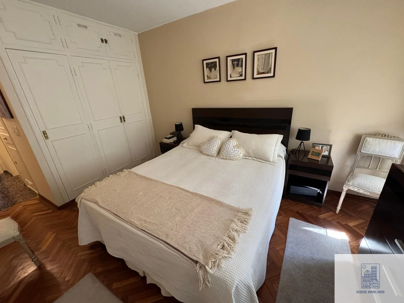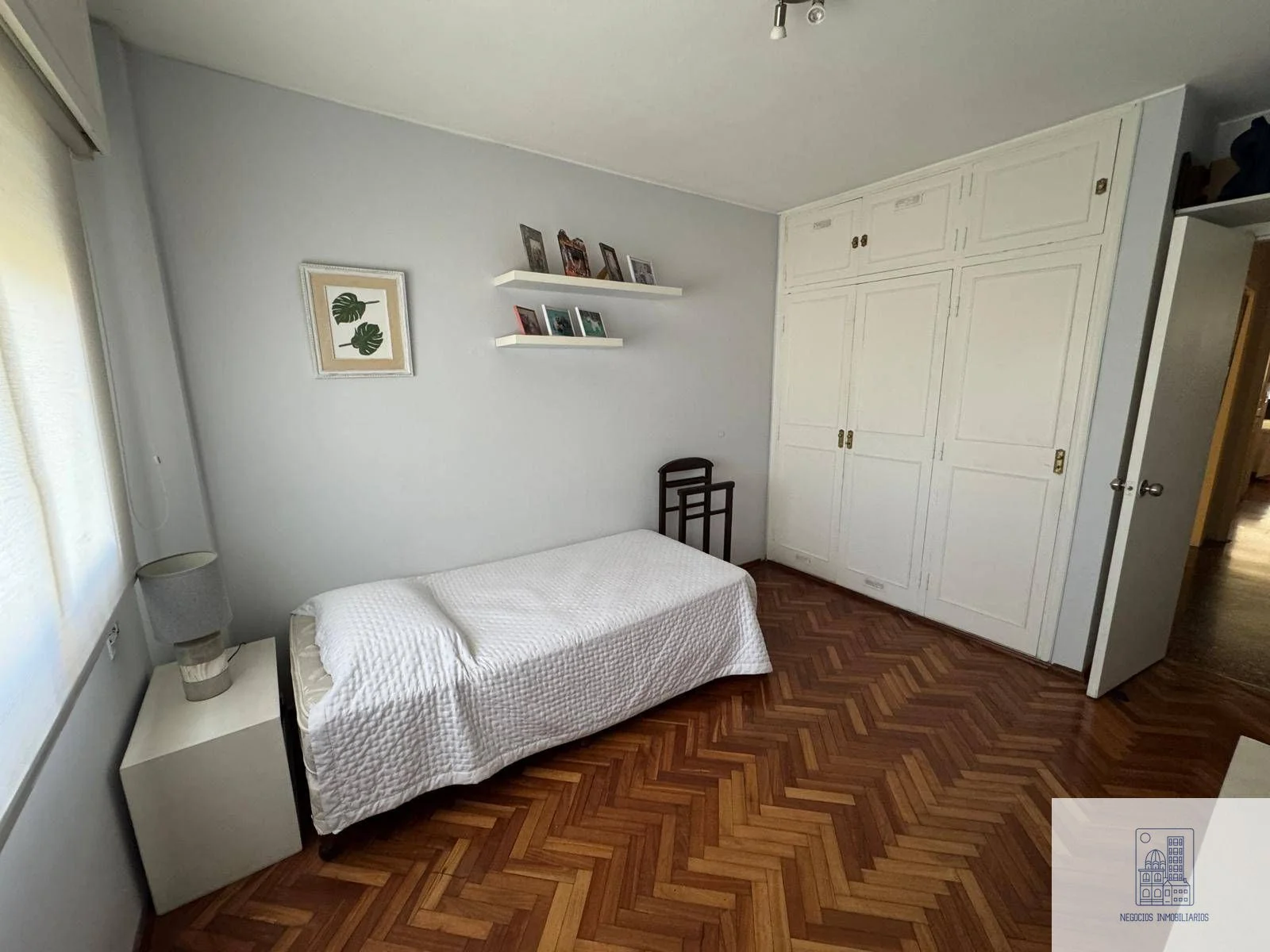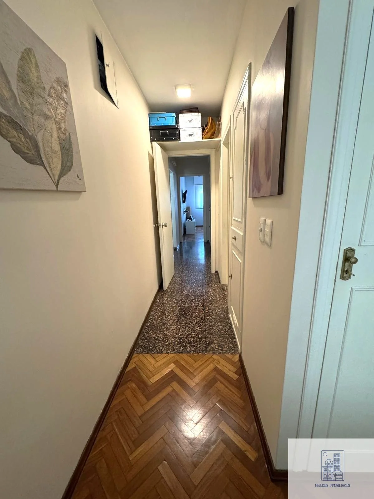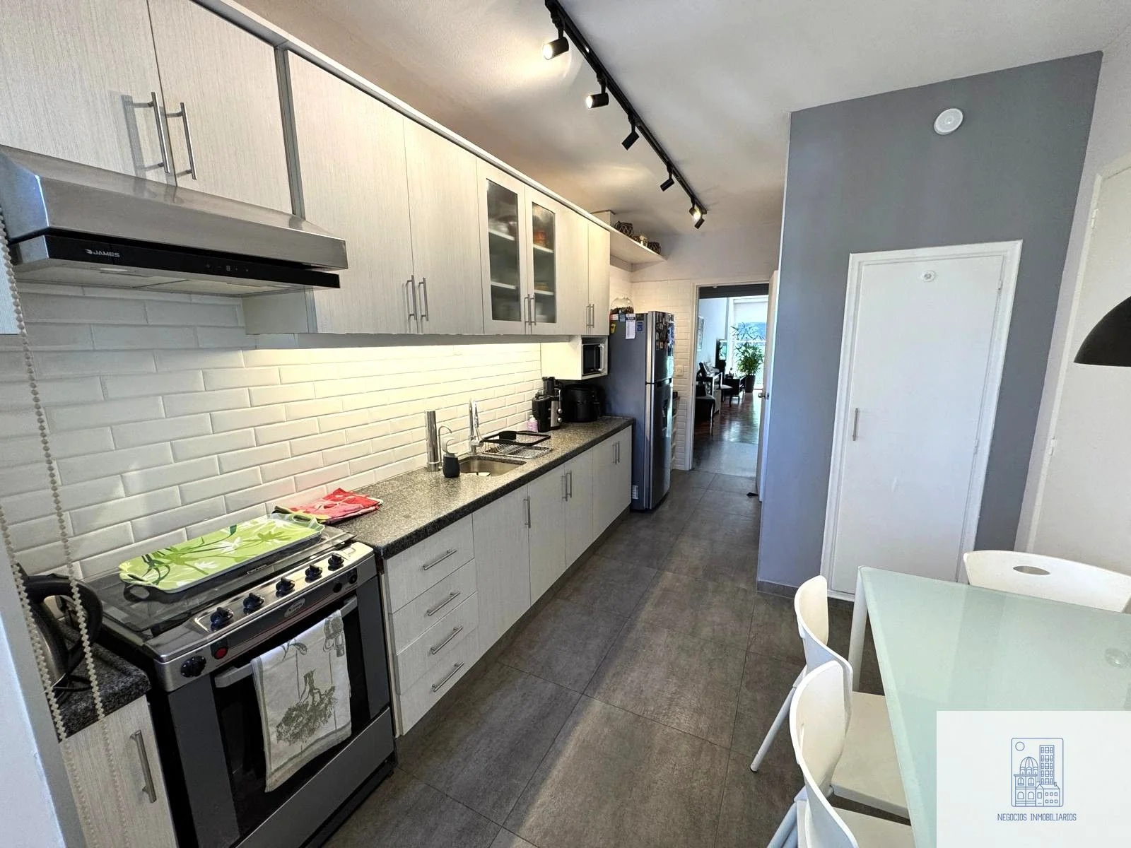 2 dormitorios de cómodas dimensiones la principal en suite, todos con placares, 3er habitación actualmente de escritorio, pasillo de distribución, entrada principal y de servicio, cocina con comedor diario, mesada de granito , profusión de placares en alto y bajo mesada, alacena, 3 baños, garage para 1 auto, calefacción central, gas por cañería, dos turnos de portería.