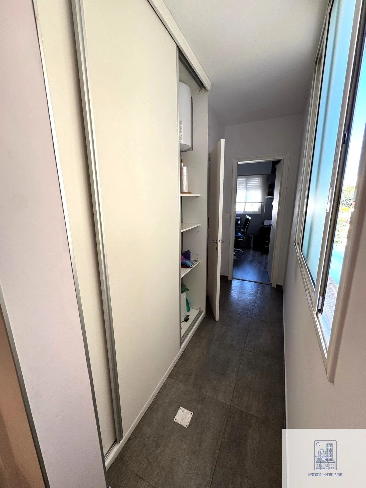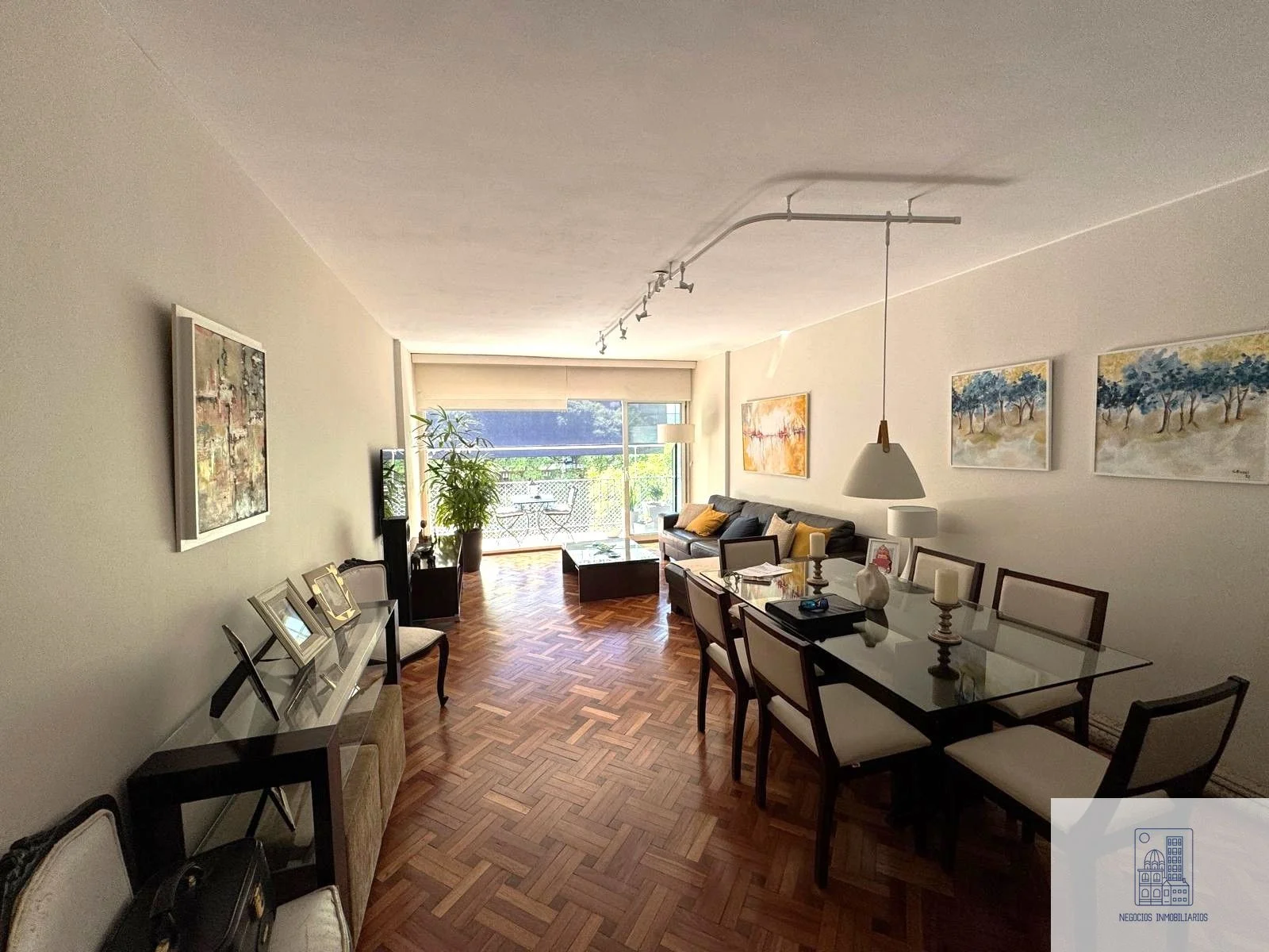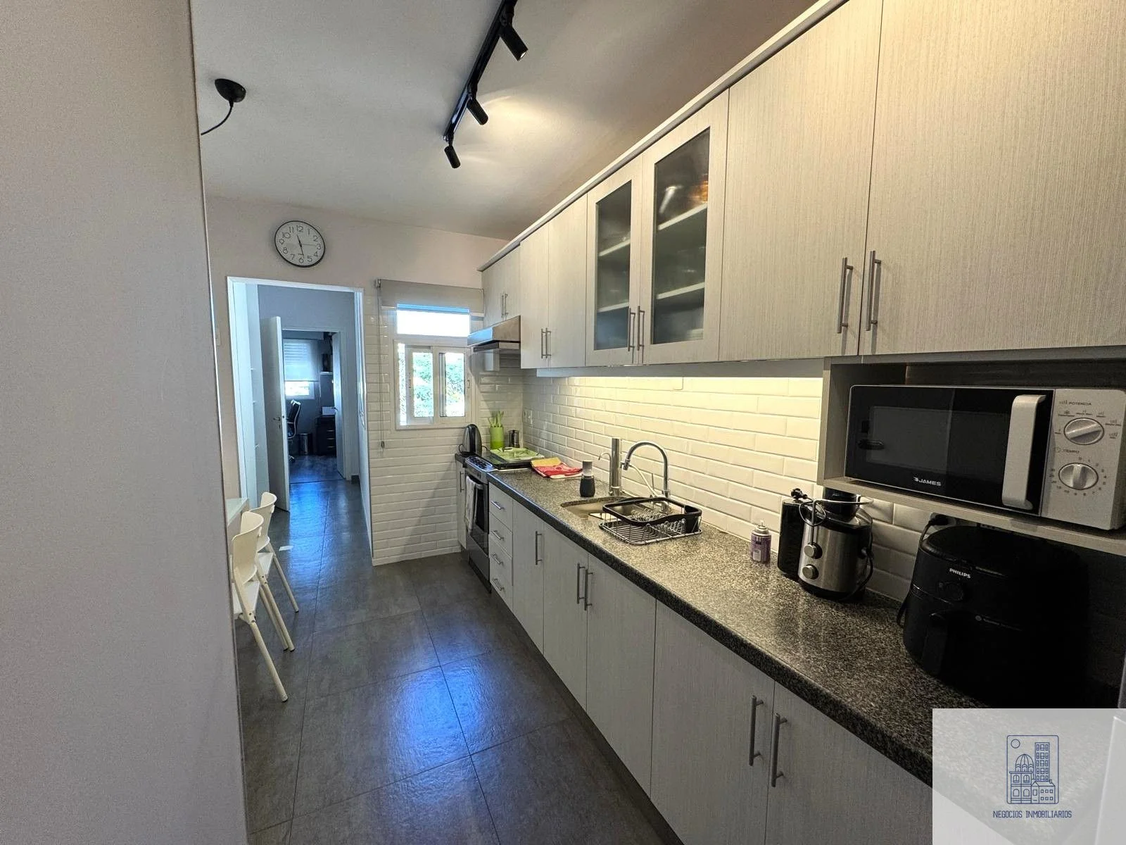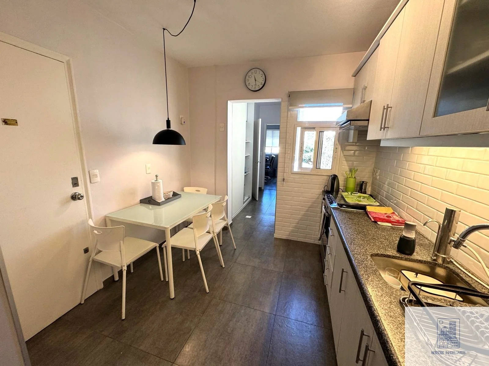 2 dormitorios de cómodas dimensiones la principal en suite, todos con placares, 3er habitación actualmente de escritorio, pasillo de distribución, entrada principal y de servicio, cocina con comedor diario, mesada de granito , profusión de placares en alto y bajo mesada, alacena, 3 baños, garage para 1 auto, calefacción central, gas por cañería, dos turnos de portería.