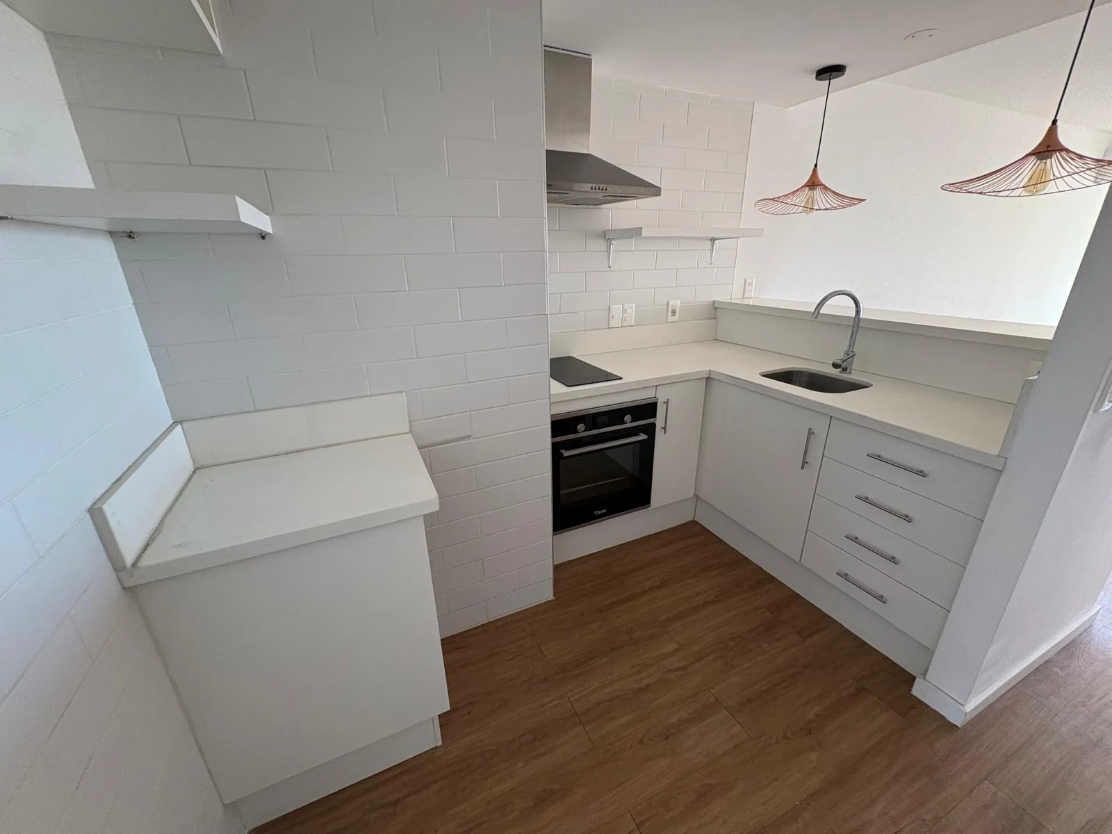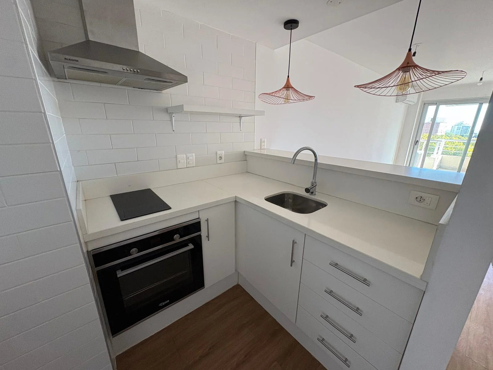 Cocina integrada equipada con campana, anafe, horno eléctrico, muebles aéreo y bajo mesada y barra desayunador