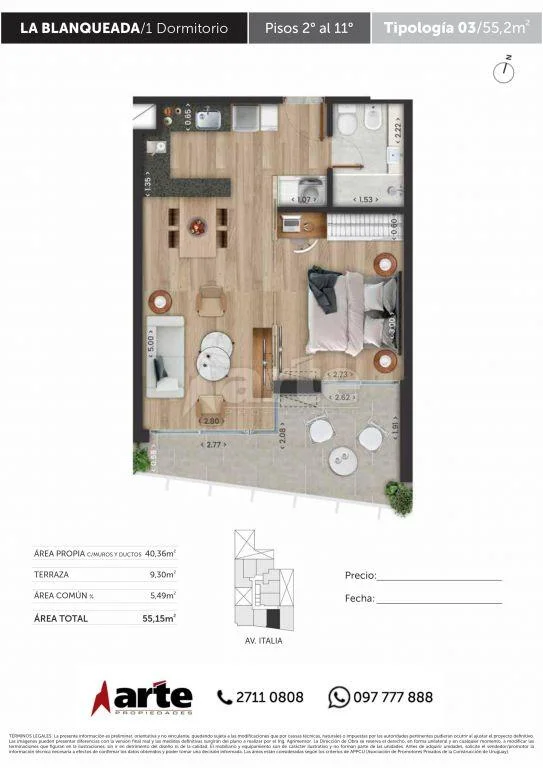 Hermoso apartamento de 1 dormitorio con gran terraza al frente en edificio de moderno diseño. Living comedor con cocina integrada y salida a amplia terraza, dormitorio también al frente son salida a la terraza. Espectacular edificio con gran frente sobre Av Italia, apartamentos de 1 ambiente, 1 y 2 dormitorios con 3 ascensores. El edificio contará con: lavadero, gimnasio, playroom, 2 SUM con parrillero, CCTV. Las unidades, de construcción tradicional, se entregan con anafe vitrocerámico, campana extractora, cerrojo electrónico y cortina de enrollar.