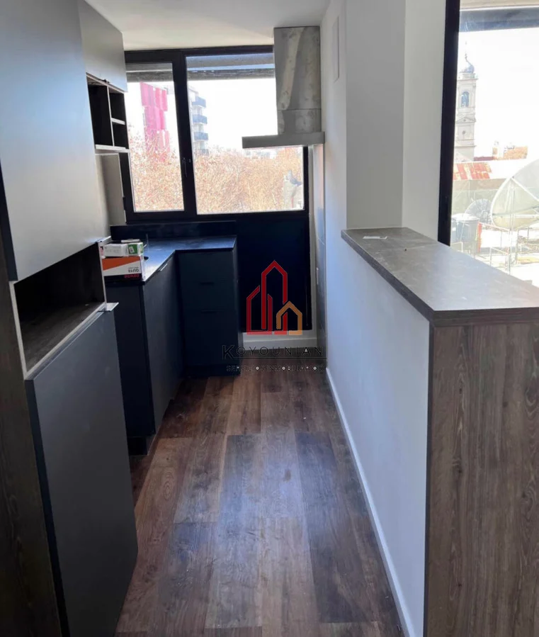 . Cocina definida y abierta (no kitchenette) con ventana al exterior, campana extractora y pasaplatos, placares modernos sobre y bajo mesada de granito negro