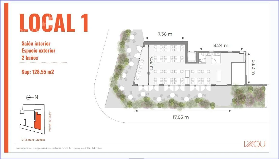 Amplio local comercial en esquina, cuenta con salón interior con 2 baños y espacio exterior.