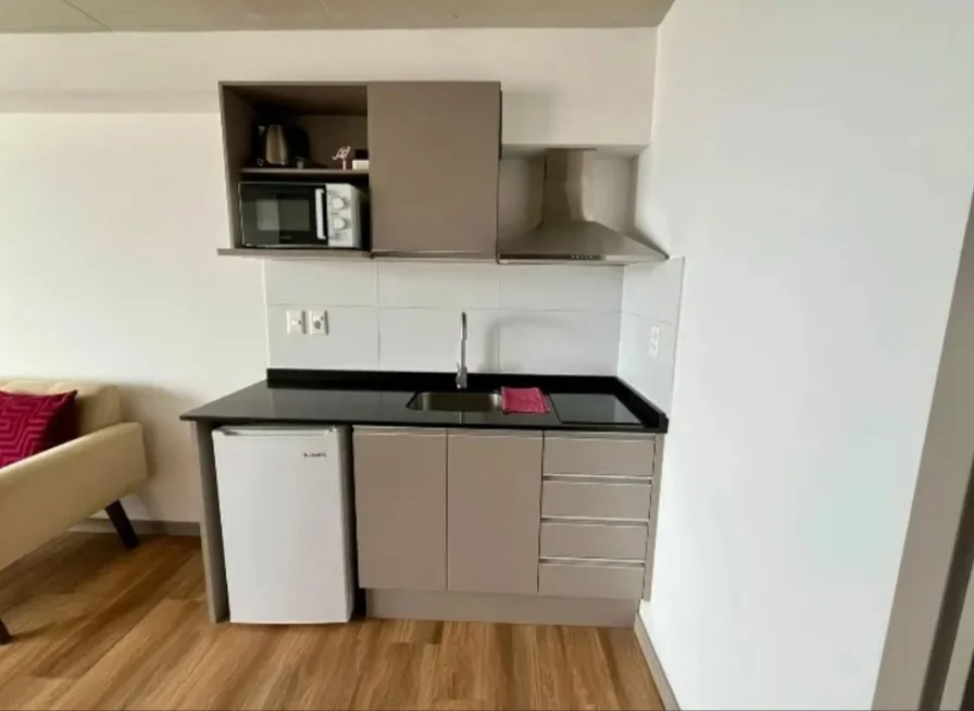 Cocina integrada con anafe, extractor, muebles aéreos y bajo mesada.