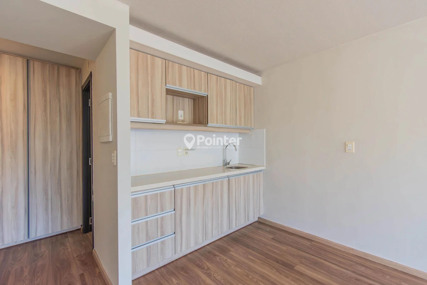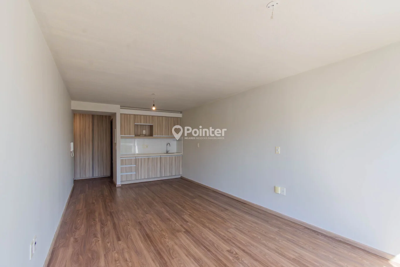 El apartamento cuenta con un espacio amplio y muy luminoso gracias a su gran ventanal, pisos de madera que aportan calidez y una cocina integrada con buen lugar de guardado.