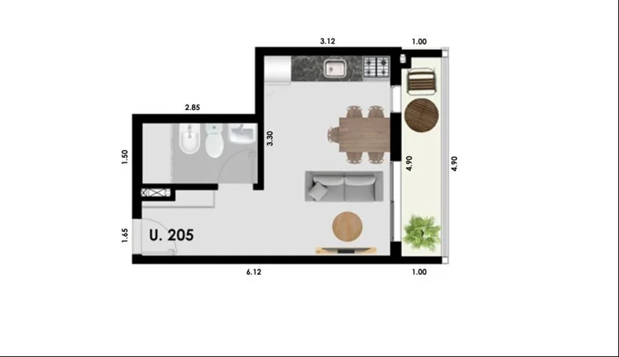 Unidad con 34 m2 totales aprox., en un segundo piso al contrafrente; además cuenta con kitchenette y balcón.