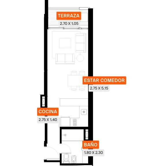 Las unidades cuentan con living comedor con cocina integrada, amplios ventanales y salida a terraza, ofreciendo ambientes luminosos y bien ventilados.