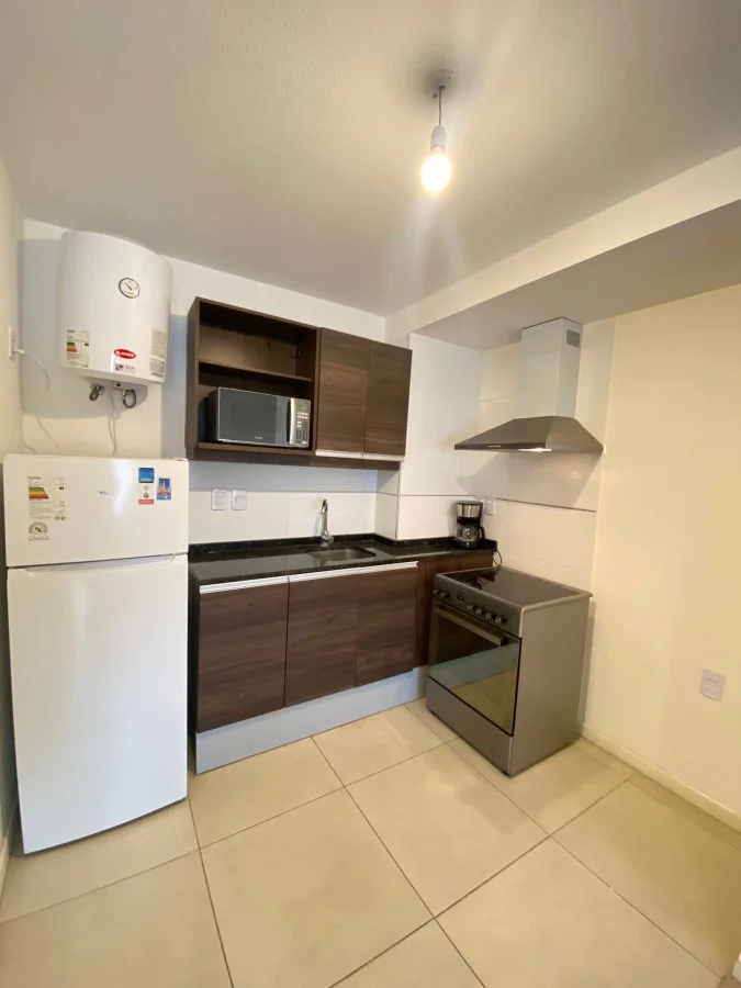Aunque no cuenta con dormitorios, este apartamento de 28 m2 ofrece un espacio de vida abierto y luminoso, con una cama cómoda y un living comedor integrado. La cocina, equipada con electrodomésticos modernos como cocina eléctrica, anafe, microondas, heladera con freezer y cafetera, es perfecta para preparar tus comidas favoritas.