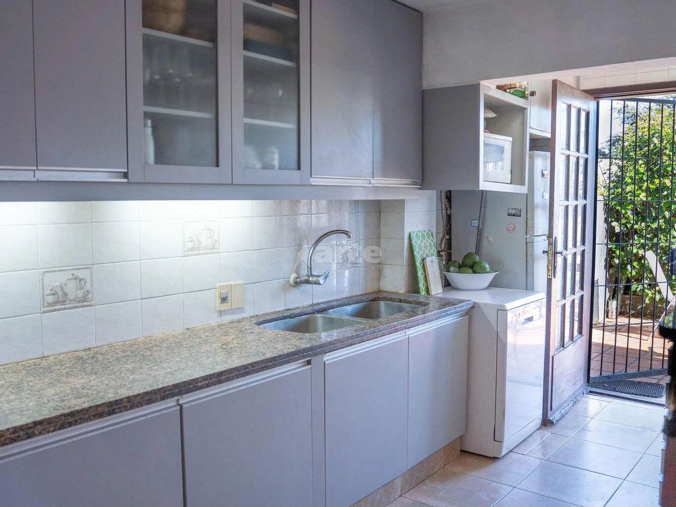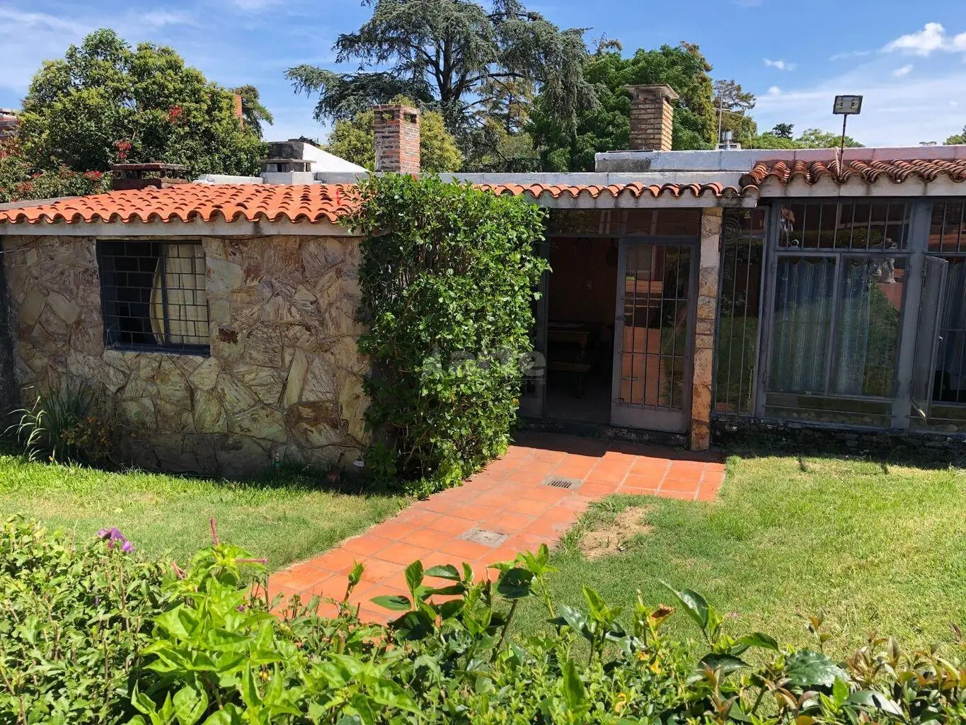 Jardín al frente y cochera techada para un coche y lugar para otro en el retiro.